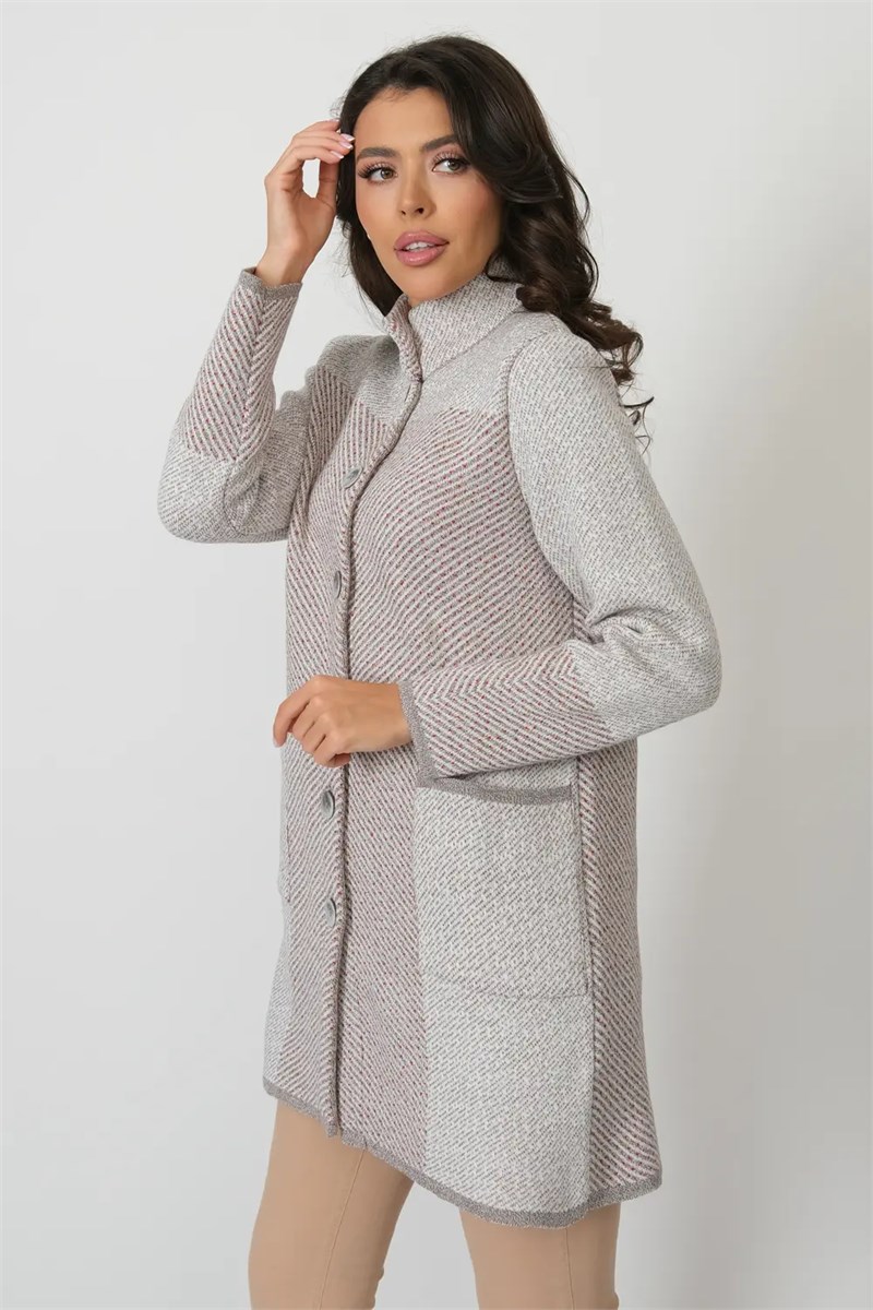 Женский вязаный кардиган полуприлегающего силуэта с воротником-стойкой. Кардиган застегивается на пуговицы. Рукава втачные длинные. Накладные карманы прямоугольной формы. Кардиган выполнен жаккардовым переплетением.