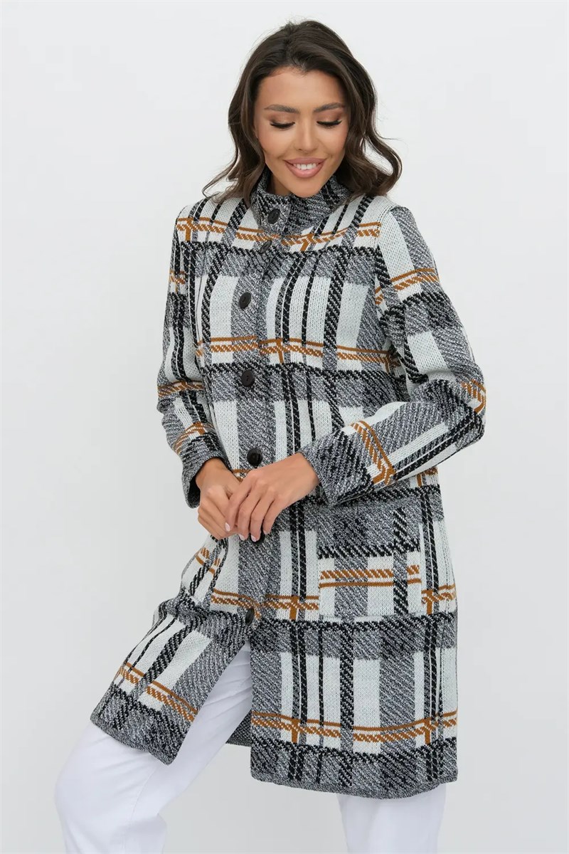 Женский эффектный вязанный кардиган прямого силуэта. Воротник-стойка. Застегивается на пуговицы Рукава втачные длинные. Два накладных кармана. Кардиган выполнен жаккардовым переплетением образующим геометрический рисунок "клетка". Он согреет вас в прохладный день и подарит ощущение невероятного комфорта.