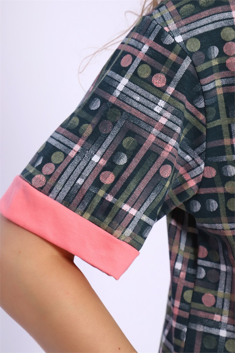 Халат женский с центральной застежкой на молнию. Рукава короткие на манжетах. Вырез горловины круглый обработан кантом. На полочках накладные карманы.