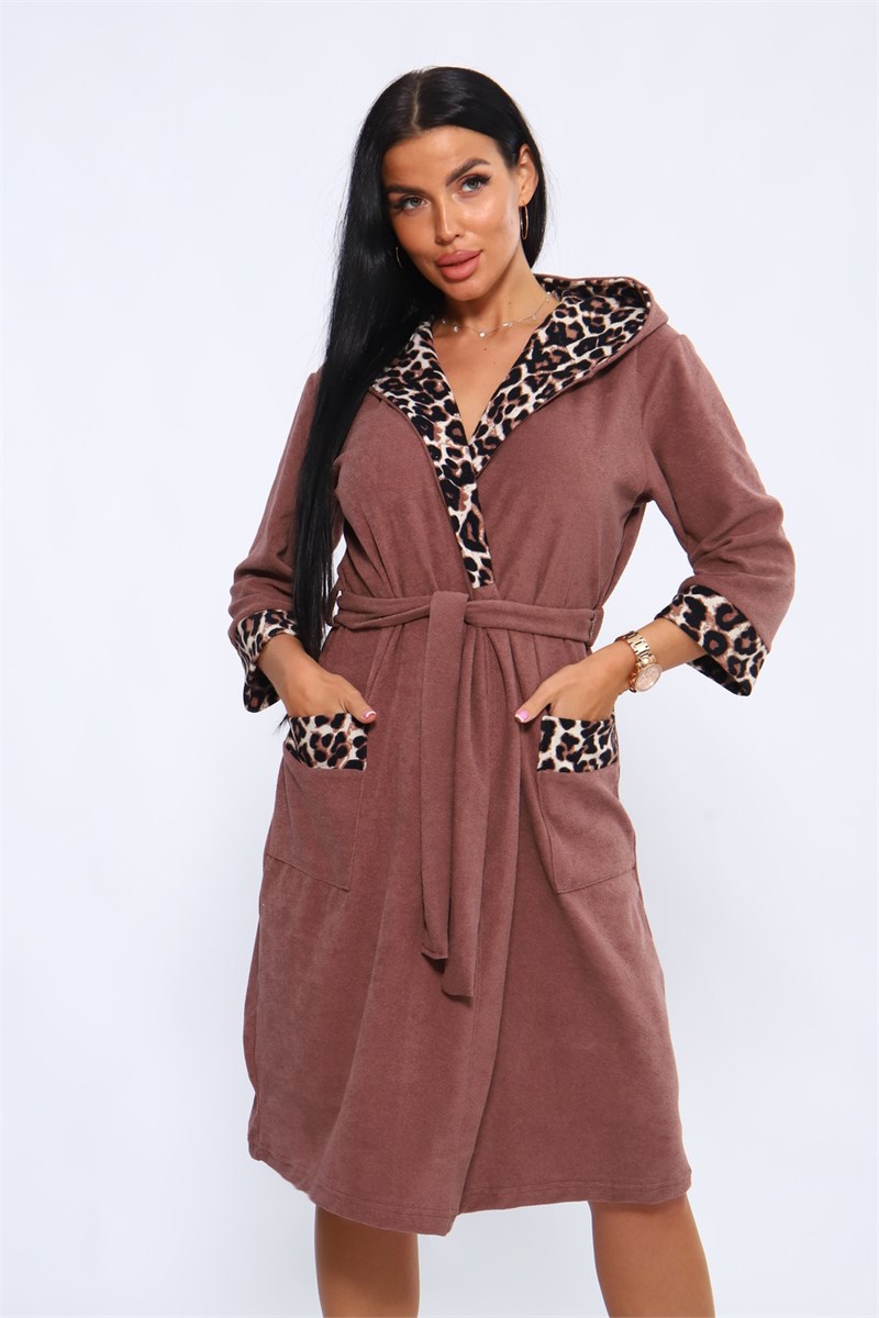 Халат женский из махры в приятном цвете. Халат с капюшоном и карманами. Халат на запах с поясом. Выполнен с тканью компаньон. Комфортный, средней длины.