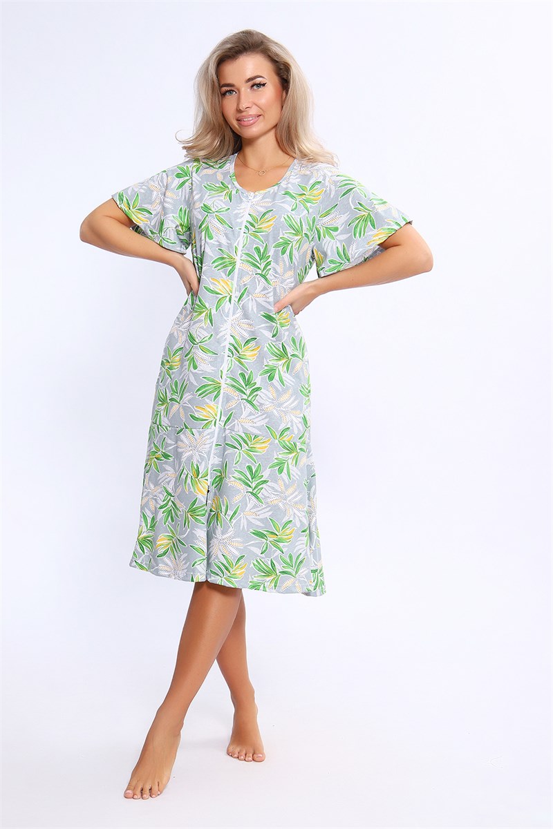 Халат на молнии полуприлегающего силуэта с короткими рукавами - крылышками и воланом по низу изделия. В боковых швах карманы. Комфортен для повседневной носки.