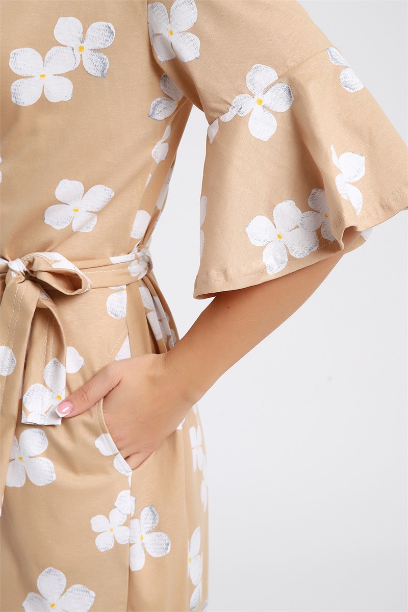 Халат полуприлегающего силуэта на запах с поясом. Рукава с воланами. Карманы в боковых швах.