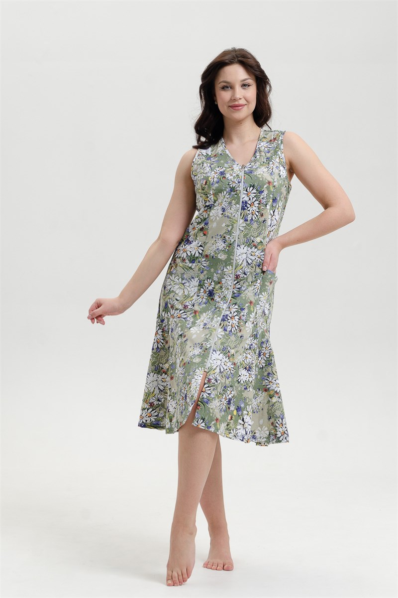 Халат женский нежной расцветки с ромашками выполнен из кулирки 100% хлопок. Халат укороченный, без рукава, на молнии, под карманом подрез, который придает изделию расклешение. Халат очень комфортный, отлично подойдет для дома и отдыха.