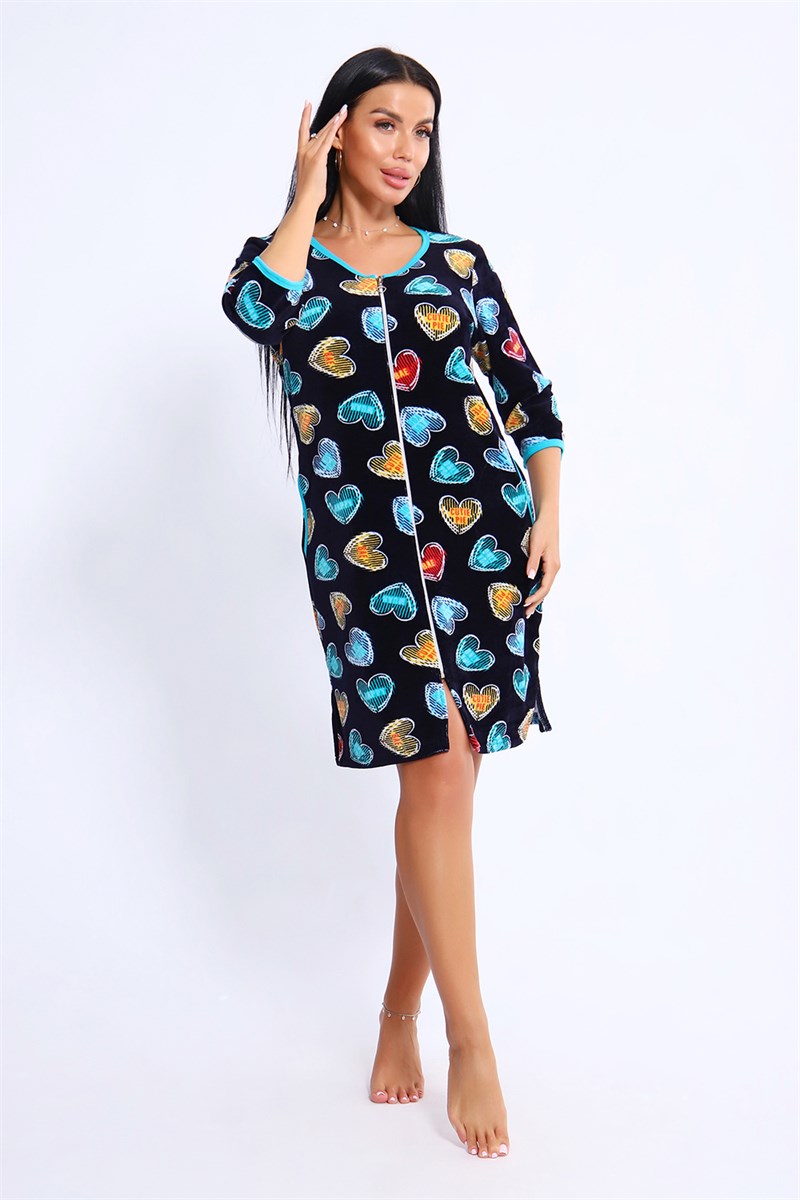 Женский укороченный халатик выполнен из качественного велюра и модного дизайна. Велюр практичен, прост в уходе и использовании. Обладает высокой устойчивостью к механическим повреждениям. Ему свойственны характеристики натуральных тканей, что делает его использование комфортным. Материал гигроскопичен, хорошо пропускает воздух и сохраняет тепло. Кроме этого он не меняет форму и не вызывает аллергических реакций. Отличается мягкостью и приятной на ощупь текстурой. Материал прекрасно дышит. Носить такой халатик Вы сможете в любое время года. Надёжный замок на молнии сохраняет свои свойства в течении всего времени использования. Женственный вырез и 2 боковых кармана добавляют образу шарм и делают изделие удобным и практичным. Изысканный, в меру длинный халат подойдёт для любого типа фигуры. А так же будет идеальным подарком на любой праздник: Новый год, день рождения, 8 марта, 14 февраля. Рекомендуется стирать в деликатном режиме 30 С. Это поможет сохранить качество изделия на долгое время.