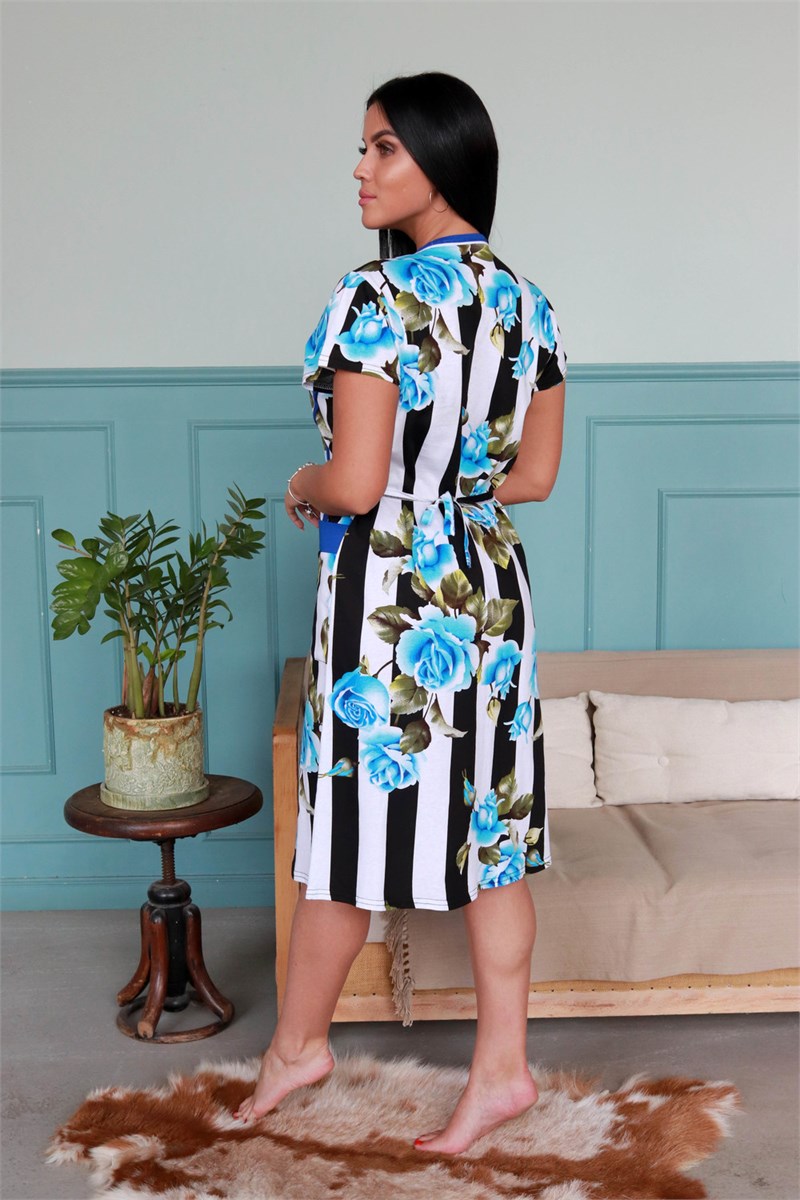 Женский халат средней длины на молнии, с красивым принтом на ткани в виде полос и роз. Общая длина приблизительно до коленей.