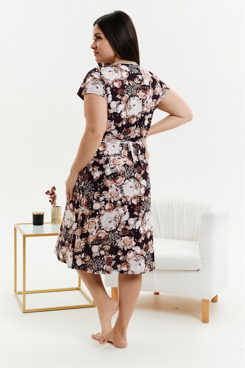 Женский халат на молнии из кулирки с коротким рукавом, длиной ниже колена, с накладными карманами, в боковых швах два полупояса. Имеется возможность приобрести данный товар по розничной цене.