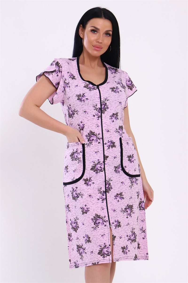 Оригинальный женский халат с красивым принтом на ткани. Рукав короткий, с накладными карманами, круглой воротник. Застежка-молния, длина ниже колена, очень приятный к телу.
