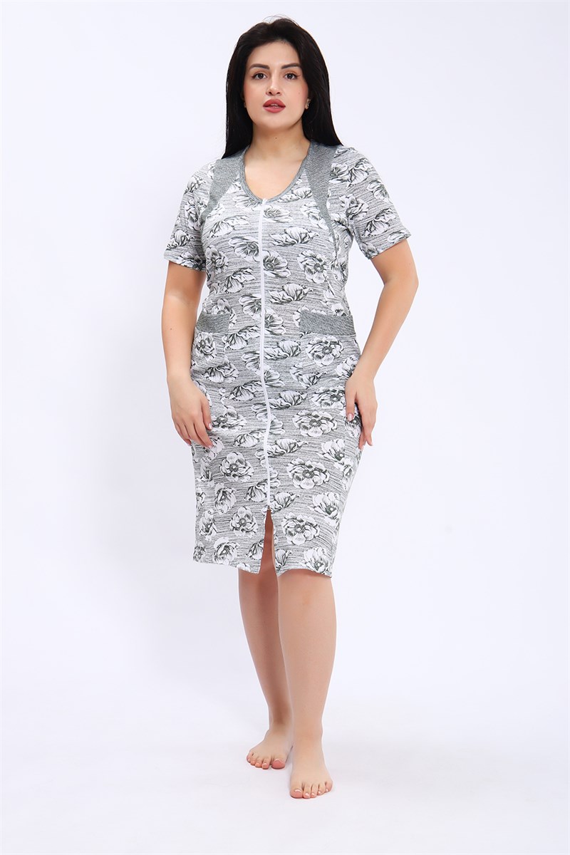 Этот халат представлен в длине миди с короткими рукавами и округлым вырезом горловины. Халат выполнен из ткани с принтом в виде крупных цветов на полосатом фоне. Центральная часть халата украшена вертикальной молнией, которая идет от горловины до нижнего края, позволяя удобно надевать и снимать изделие. Модель также имеет небольшие разрезы внизу для свободы движения. На передней части расположены удобные накладные карманы, выполненные из той же ткани, что и сам халат. Цветовая гамма сочетает оттенки серого и белого, что делает халат стильным и практичным для повседневного ношения.