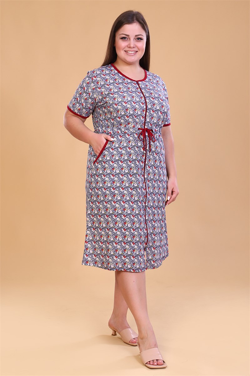 Женский халат из натурального 100% хлопка. Для удобства посадки на талии предусмотрена кулиска. Халат свободного покроя и длиной ниже колена не стеснит ваших движений. Оригинальный цветочный принт выглядит современно и привлекательно. В такой модели будет удобно женщине любого возраста. На модели 52 размер