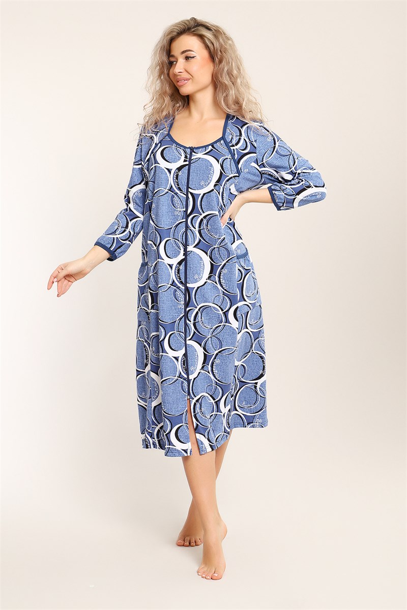 Халат на молнии удлиненный размеры с 48 по 66. Застежка на молнию, рукава 3/4, свободный покрой. Изготовлен из натуральной хлопковой трикотажной кулирки с красивым геометрическим орнаментом.