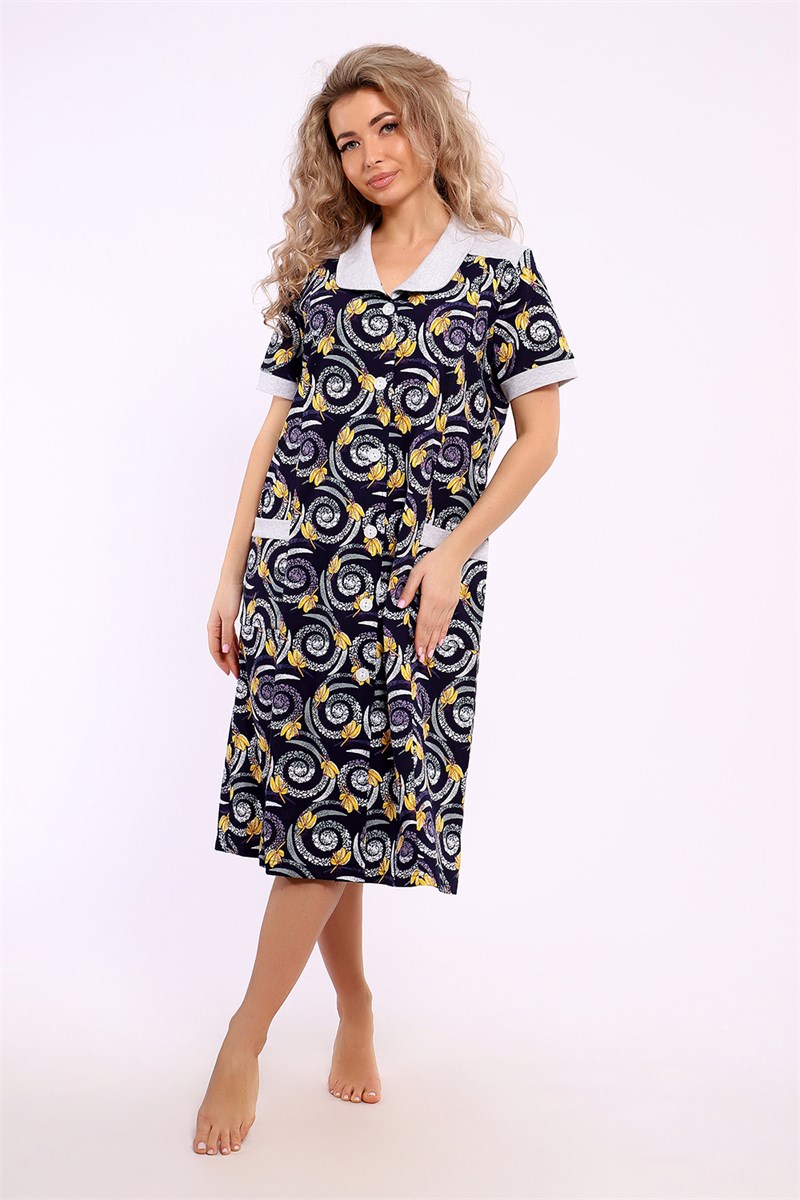 Халат домашний на пуговках, удлиненный, воротник из отделочной ткани. По полочке - рельефные швы, они обеспечивают удобство посадки. Имеются боковые карманы.