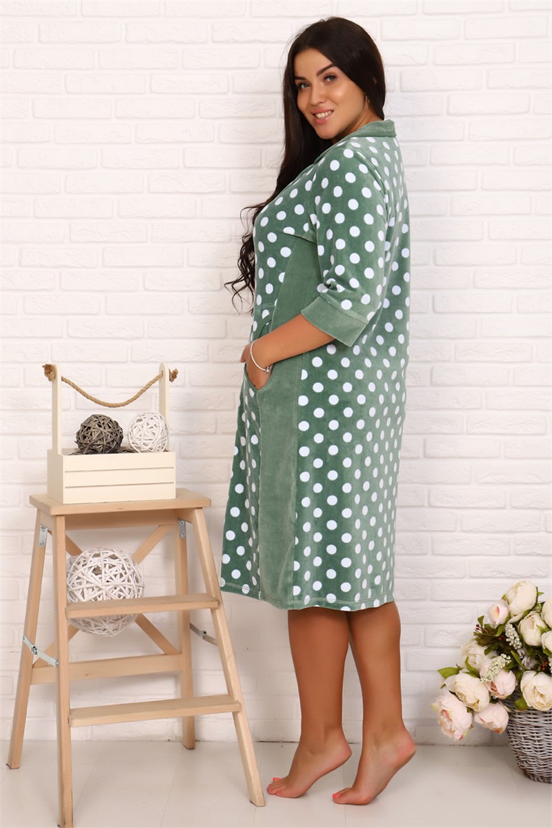 Халат велюровый на молнии в горошек. Воротник-стойка, рукава 3/4 на манжете, по бокам однотонная вставка, с карманами. Ткань велюр, качество отличное, после стирки цвет не теряет, не деформируется, приятное к телу. Для дома и отдыха.