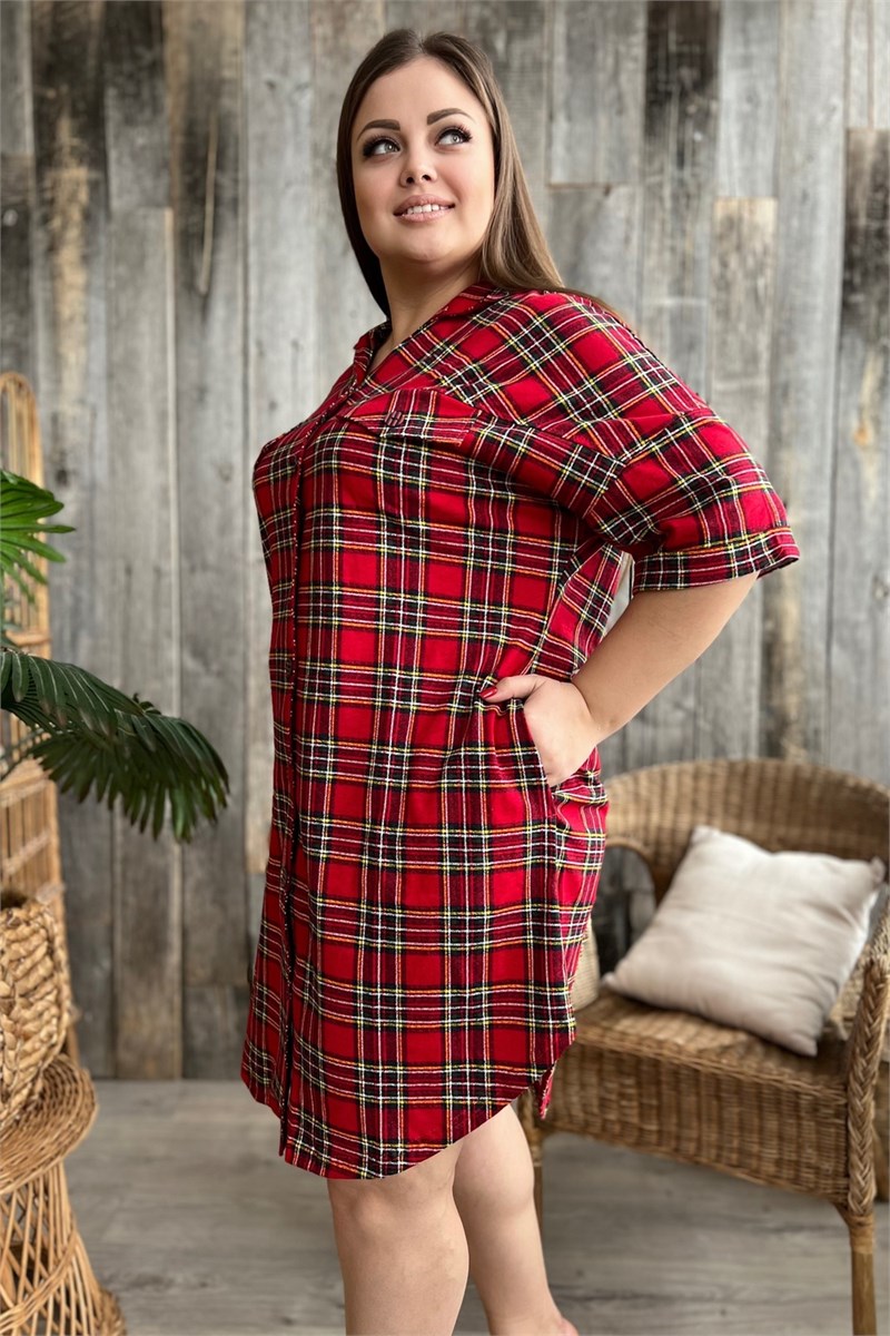 Халат-рубашка на пуговицах, с отложным воротником, свободная, с удлиненной спинкой и фигурной линией низа. Рукав короткий, на манжете. Полочки с кокетками и клапанами. Спинка с кокеткой и складкой. На модели 52 размер