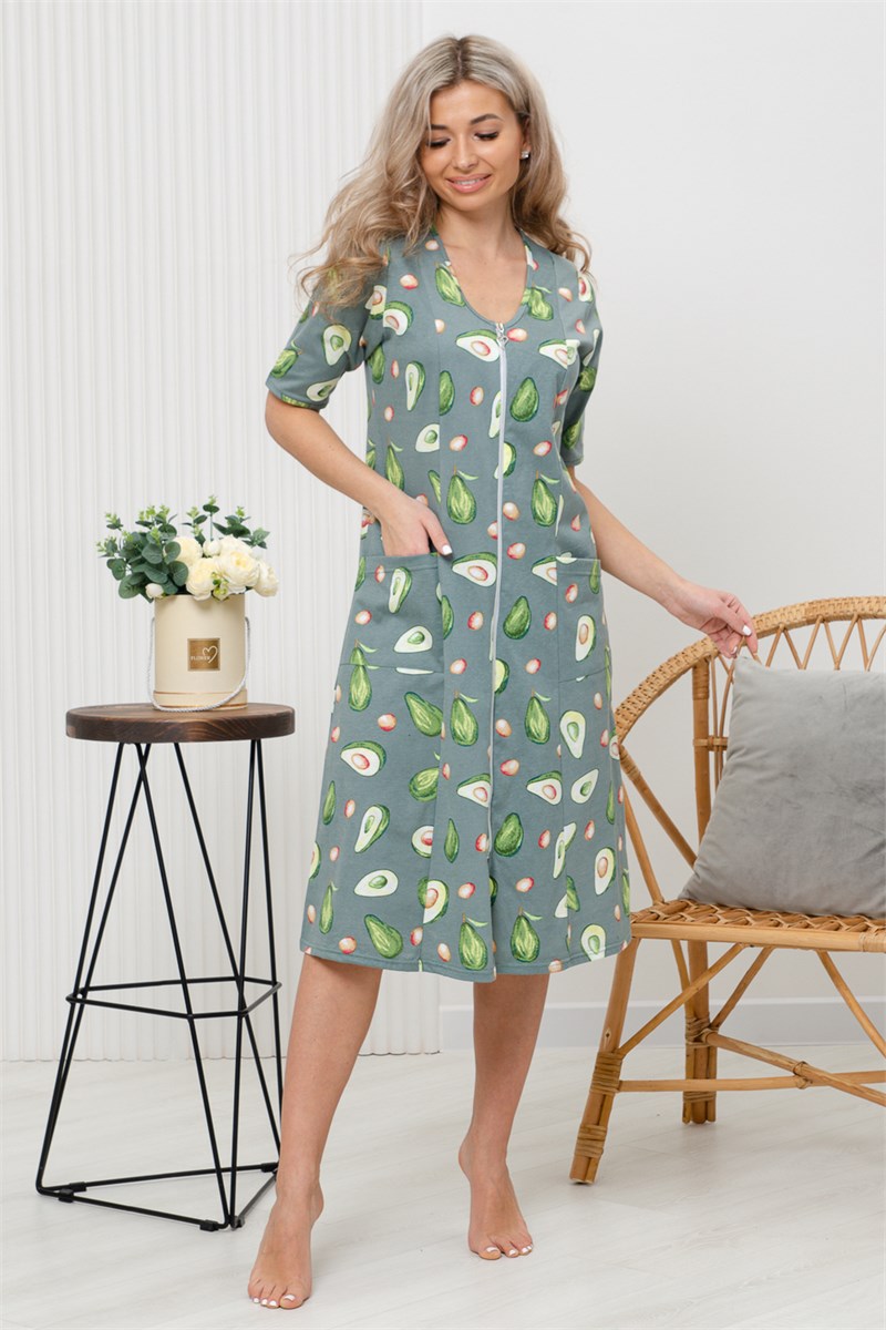 Халат женский оригинальной расцветки выполнен из 100% хлопка. Горловина имеет V-образный вырез, рукав короткий. Халат на молнии средней длины. подойдет для повседневной носки и отдыха.