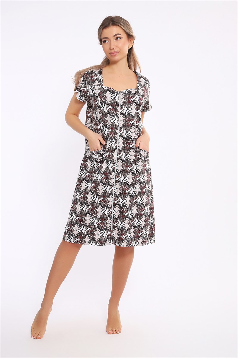 Женский халат на молнии. На полочках рельеф, который подчеркнет вашу фигуру. В рельефе карман. Рукав короткий. Красивый вырез на полочке. Халат прекрасно подойдет для дома, дачи и отдыха.