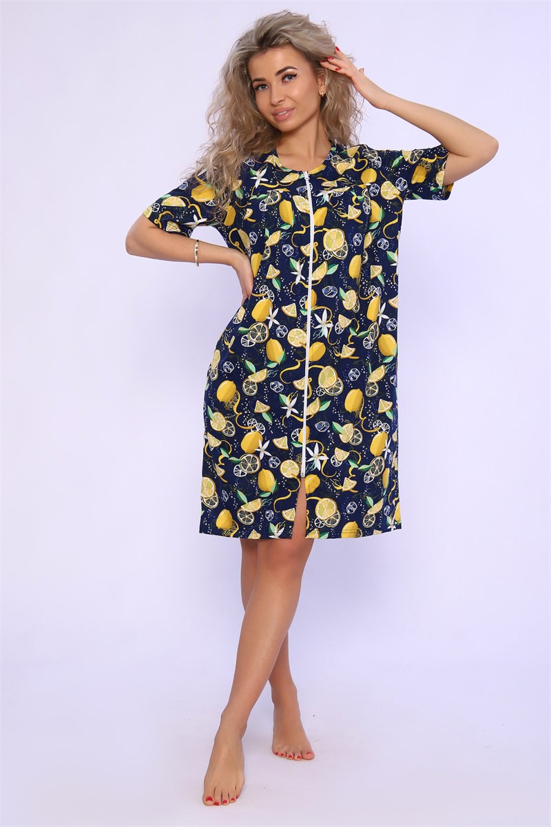 Халат на молнии с короткими рукавами и боковыми карманами. Полочки с отрезной кокеткой и складками над грудью. Комфортен для повседневной носки.