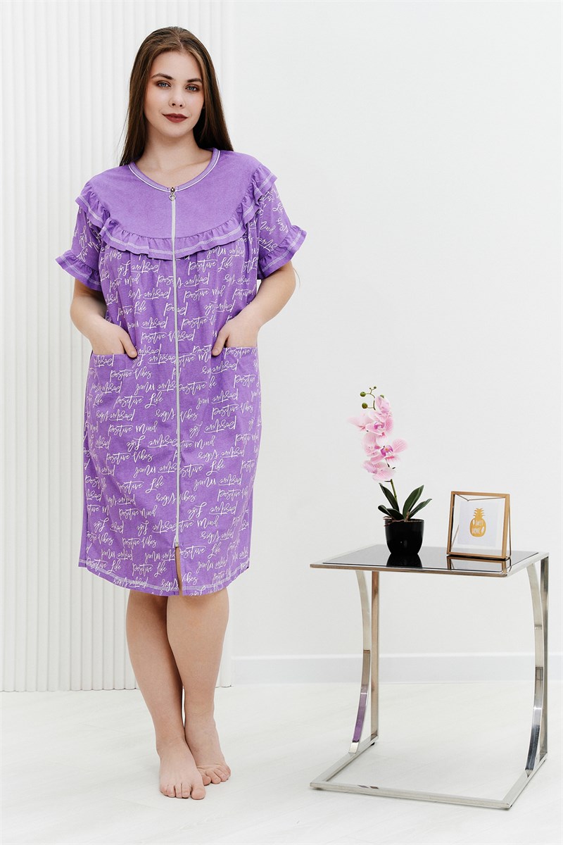 Халат женский, полуприлегающего силуэта, горловина округлая, застежка на тесьму-молнию. На полочке кокетка с рюшей, также рюша внизу цельнокроенного короткого рукава из отделочной ткани. Внутренние горизонтальные карманы в шве стачивания верхней и нижней части полочки.