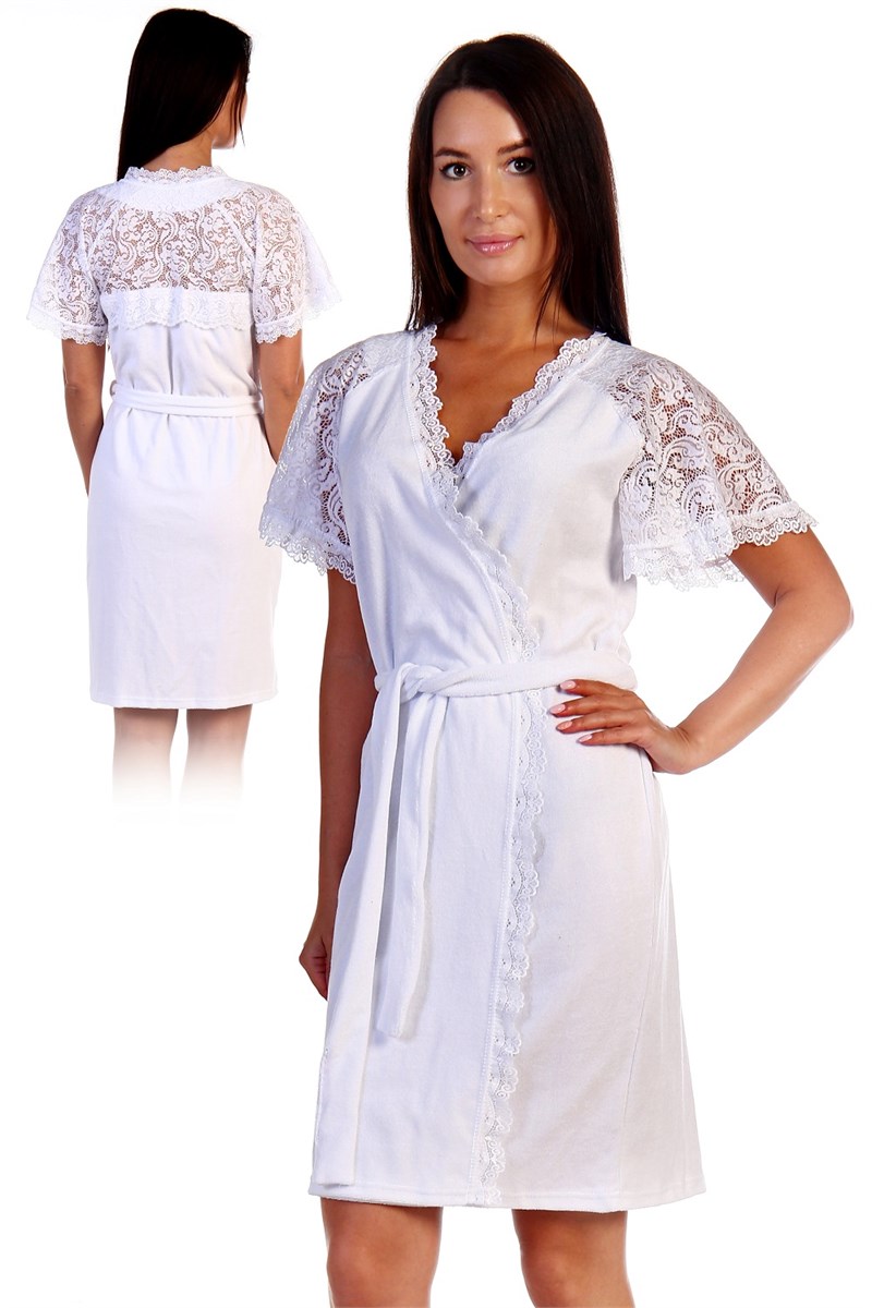 Махровый запашной халат с поясом. Декоративные вставки из кружева, длина чуть выше коленей, кружевные рукава чуть выше локтей. Три варианта расцветки белая, ментоловая и персиковая. Размеры от 40 до 52. Имеется возможность розничного приобретения товара.