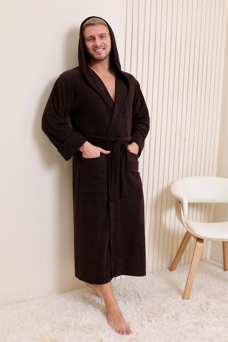 Халат мужской махровый длинный на запах с капюшоном. Длинный рукав с внутренним манжетом. Ткань легкая махра.