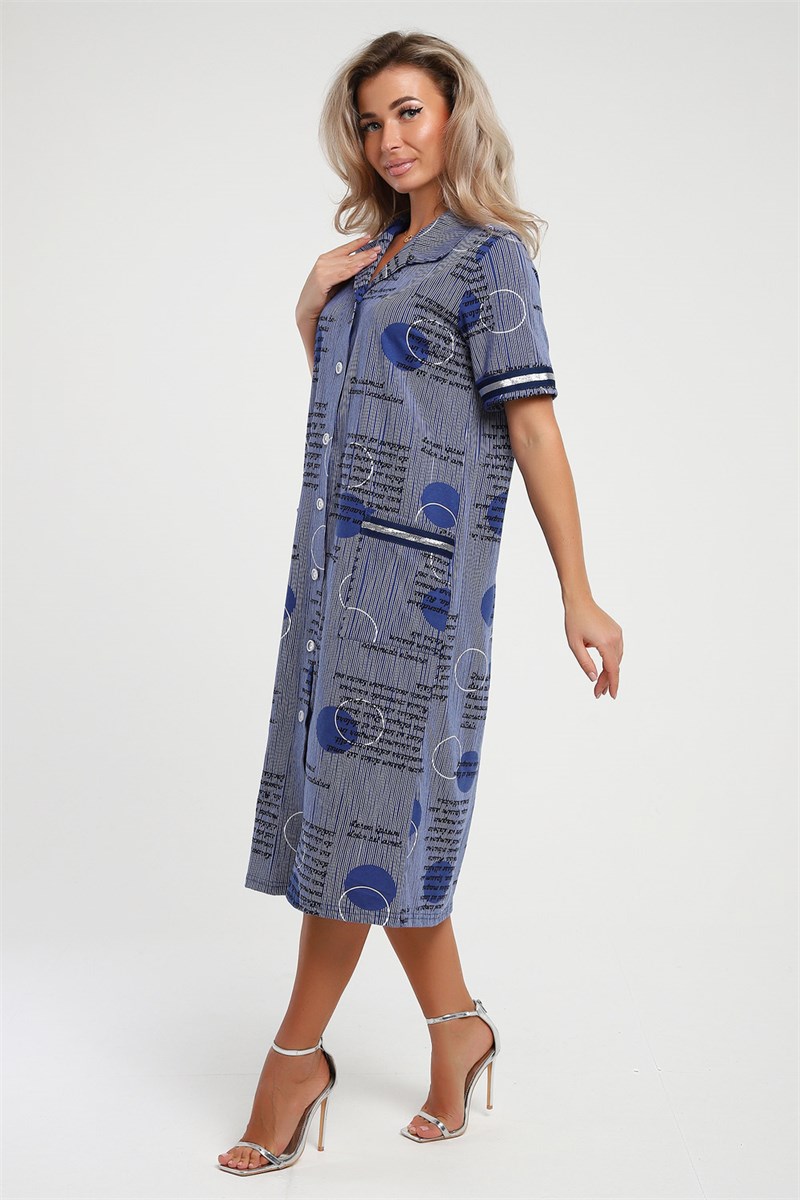 Халат женский трикотажный на пуговицах. Удлиненный, с красивым геометрическим оргаментом. Воротник отложной, есть два кармана, декорирован серебристой тесьмой.