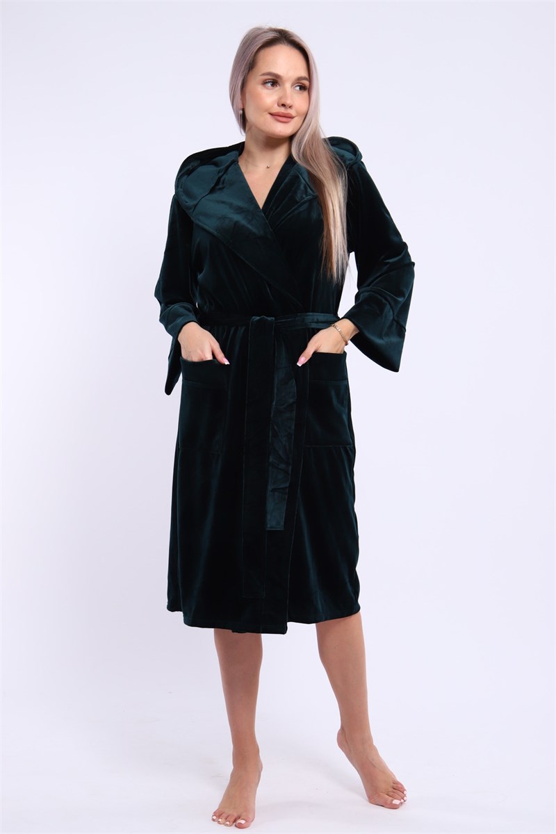 Халат женский на запах из ткани велюр. Халат на запах с поясом и с капюшоном, карманы по бокам настрочные, рукав 3/4 широкие с манжетами. Длина халата средняя, размер полный. Цвета насыщенные благородные с переливом.