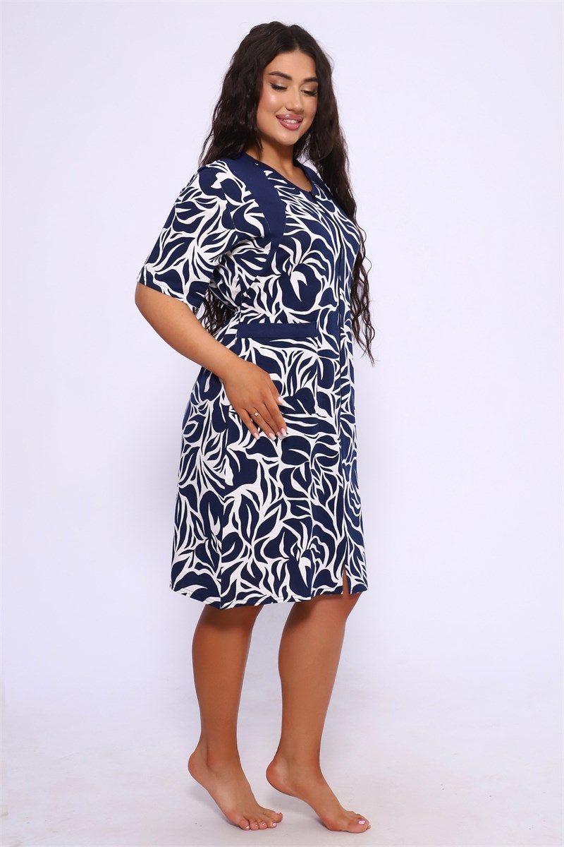 Оригинальный женский халат с красивым принтом на ткани. Рукав длинный с накладными карманами, V- образным воротником. Застежка-молния, длина ниже колена, очень приятный к телу.