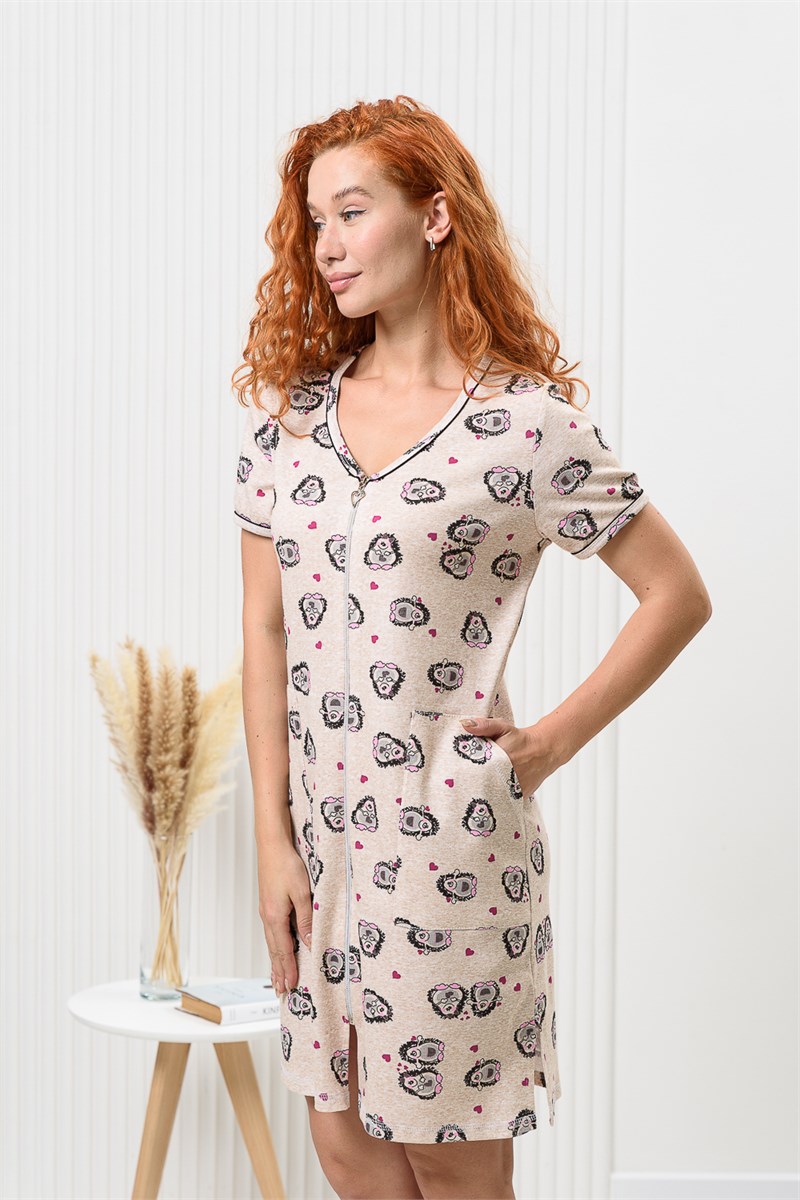 Халат на молнии, полуприлегающего силуэта, длиной выше колена, с V-образной горловиной, с накладными карманами. Рукав втачной, короткий. В нижней части боковых швов обработаны разрезы. Горловина и низ рукавов обработаны бейкой, из основного полотна, с отделочным кантом.