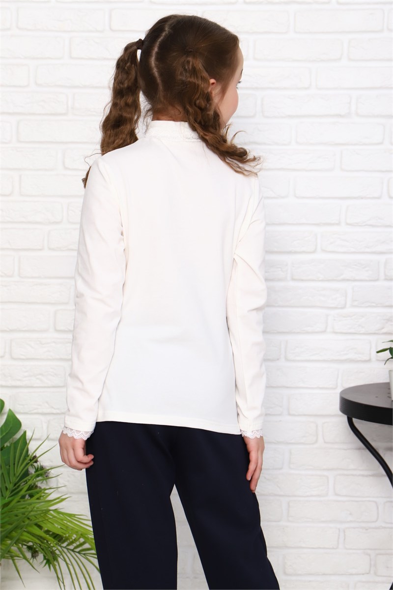 Базовая школьная блузка для девочек с длинным рукавом. Нарядная блузка станет основой повседневного образа. Мягкое кружево по воротнику - стойке и низу рукава придает модели нежности. Модель составит одинаково удачный комплект и с юбкой, и с брюками. Блузка сшит из качественного трикотажа, используемый материал не теряет форму после многократных стирок, мягкий и приятный к телу, устойчив к износу. Для сохранения первоначальных свойств изделия, важно соблюдать рекомендации по уходу.