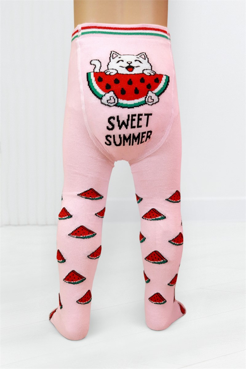 Детские колготки для самых вкусных и маленьких деток. На задней части вязаный рисунок котика с арбузом. На ножках кусочки арбуза.