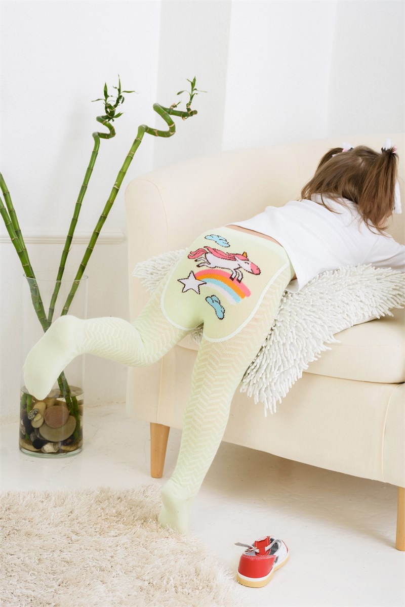 Очаровательные колготки в нежных оттенках. По всем поверхности вывязан узор, сзади - рисунок в виде единорога на радуге