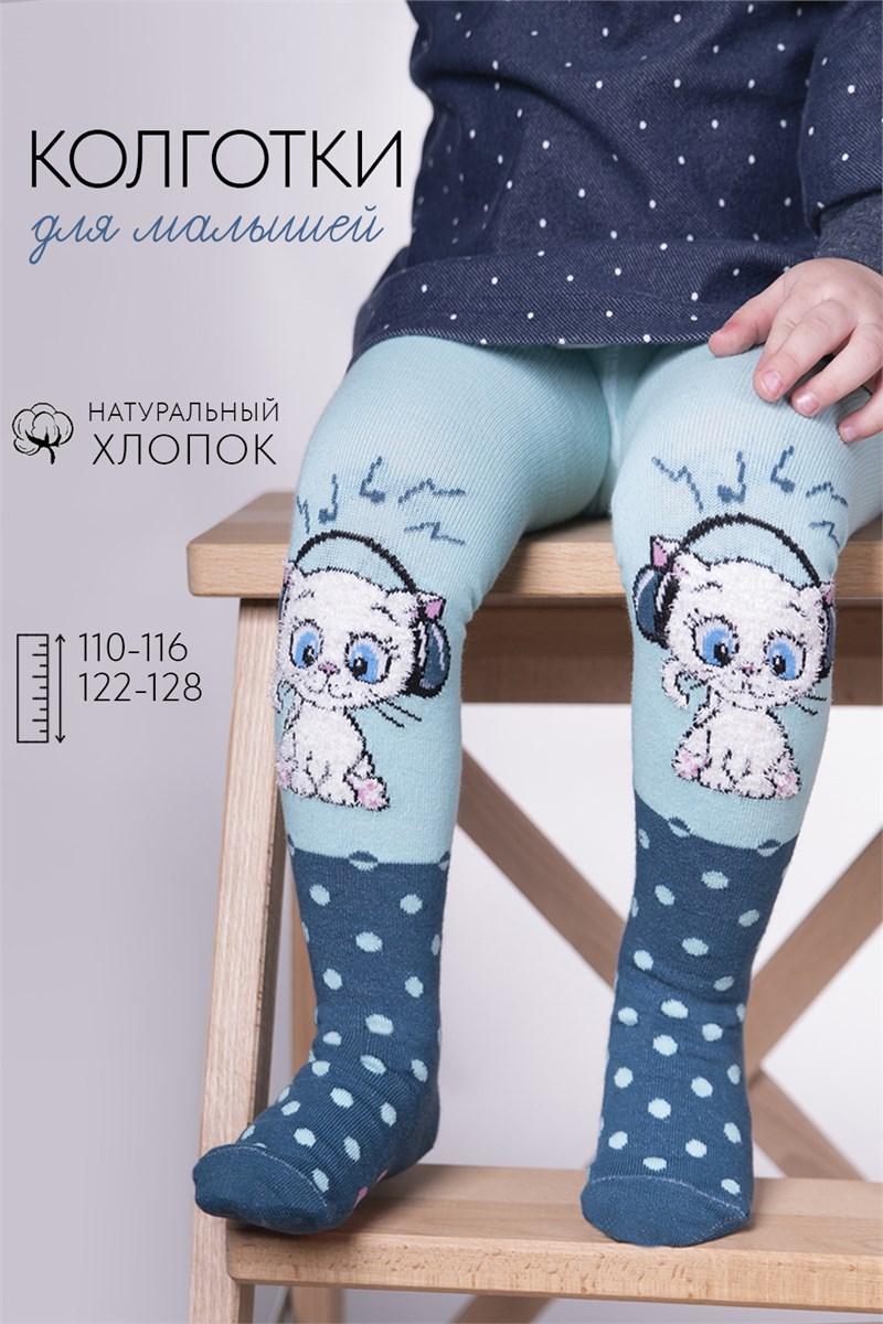 Оригинальные детские колготки с вывязанным пушистым котенком в наушниках и носком в горошек.