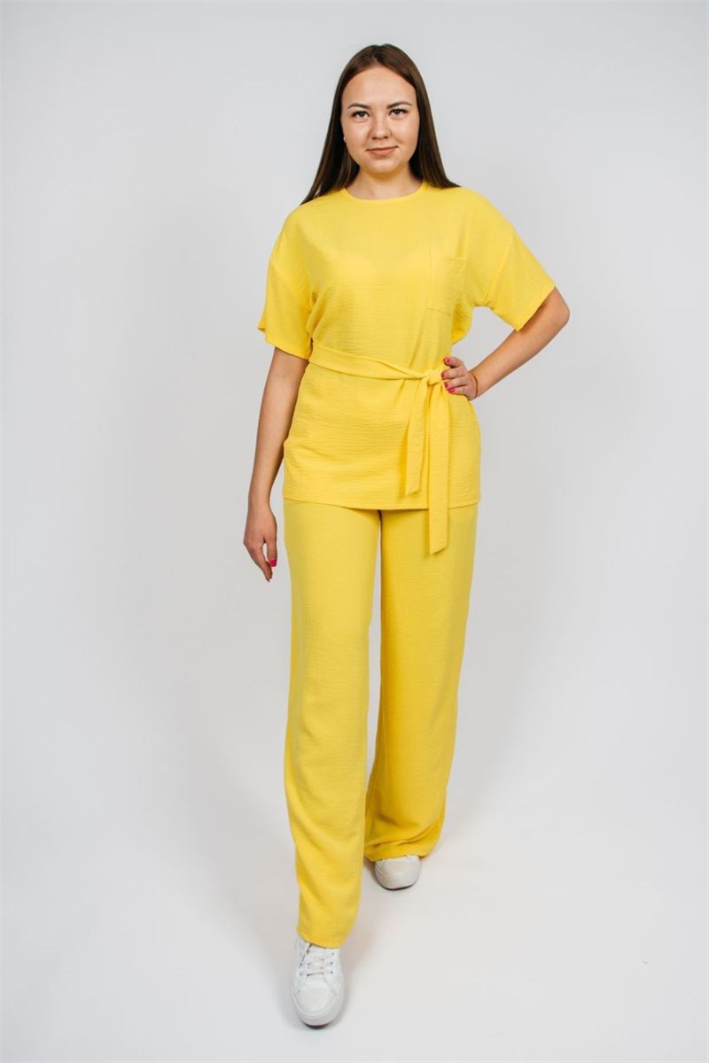 Костюм из легкой струящейся ткани, простой в своем исполнении, обладает особым шармом. Прямые брюки, свободного кроя верх - невероятно привлекательный цвет создают тот самый гармоничный образ стильной леди. Брюки на резинке, есть карманы. Блуза свободного кроя, на полочке карман, рукав спущенный. В комплекте пояс из основной ткани. Уход за изделием: бережная стирка до 30 градусов; нельзя отбеливать; деликатный отжим; гладить при t не более 110 С; гладить с изнанки. Возможна усадка. Допуск отклонения длины при массовом производстве 1-3 см является нормой. Модель рассчитана на рост 170-176 см.