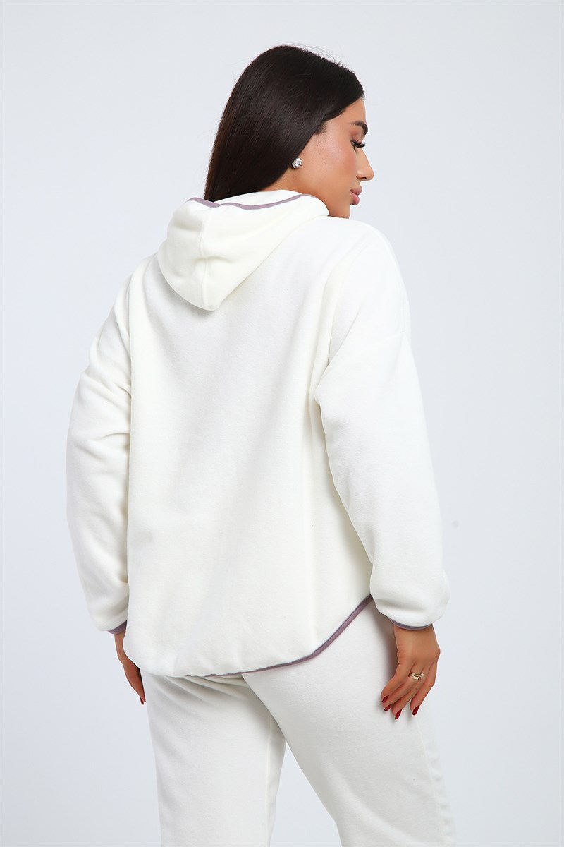Костюм женский свободного кроя выполнен из мягкого флиса. Костюм состоит из брюк и худи. Брюки с карманами, внизу на резинке; худи с капюшоном, края обработаны кантом контрастного цвета. Костюм очень комфортный и прятный к телу, прекрасно подойдет как для дома, так и для прогулок и спорта.