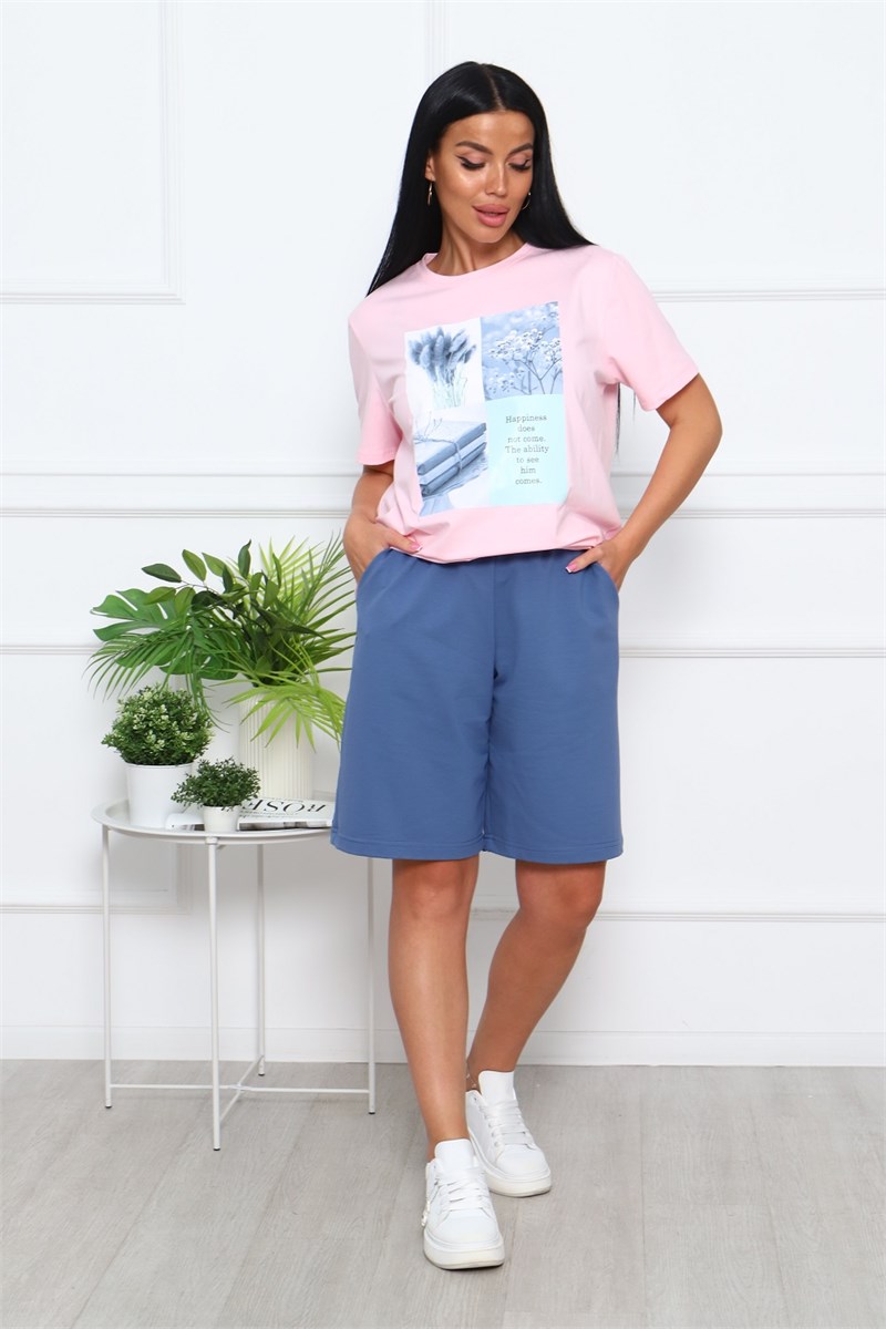 Костюм женский: шорты с боковыми карманами, на поясе и футболка классическая с короткими рукавами и стильным принтом на груди. Трикотаж отличного качества подарит комфорт и презентабельный вид.