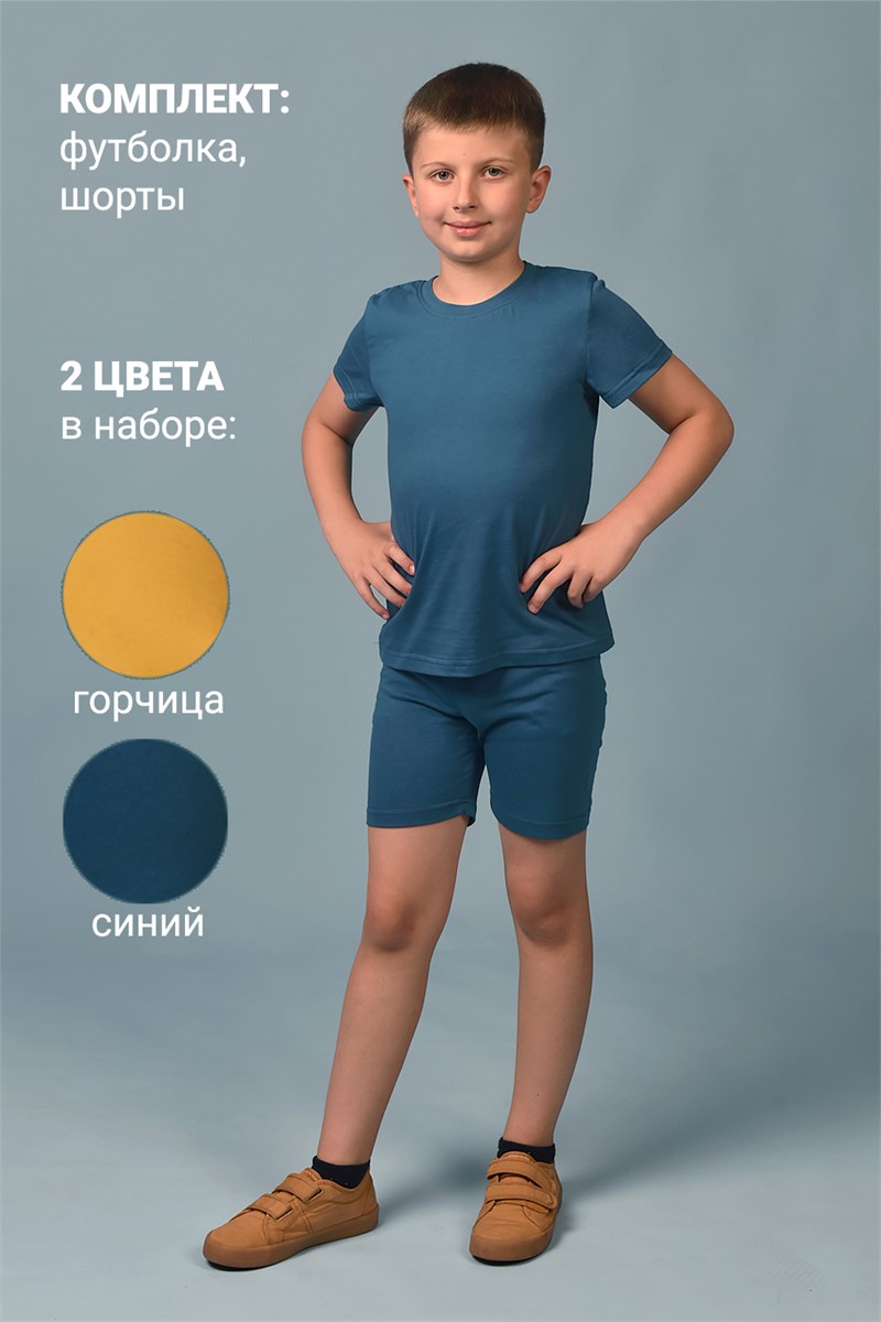 Костюм для мальчика выполнен из экологичной хлопковой ткани-кулирное полотно. Набор из 2 комплектов. Футболка прямого кроя. Вырез горловины округлый,  рукав втачной, короткий. Шорты короткие, без карманов, пояс на резинке. Ткань легкая, приятная к телу, хорошо пропускает воздух. Натуральный хлопок обеспечит комфорт ребенку во время летних прогулок или носки дома, в детском саду.