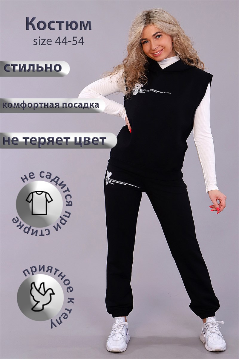 Костюм женский - брюки и жилет с цельным двойным капюшоном. Данная модель выполнена из трикотажного полотна футер 2-х нитка. Жилет свободного покроя, с отрезным бочком. Отделка на жилете из эластичного трикотажного полотна кашкорсе. Пояс брюк обработан трикотажными строчками. На полочке, спинке, на правой ноге спереди и на левой ноге сзади присутствуют принты. В качестве осеннего варианта костюм можно сочетать с водолазками и лонгсливами. Модный стильный костюм порадует вас в любую погоду.
