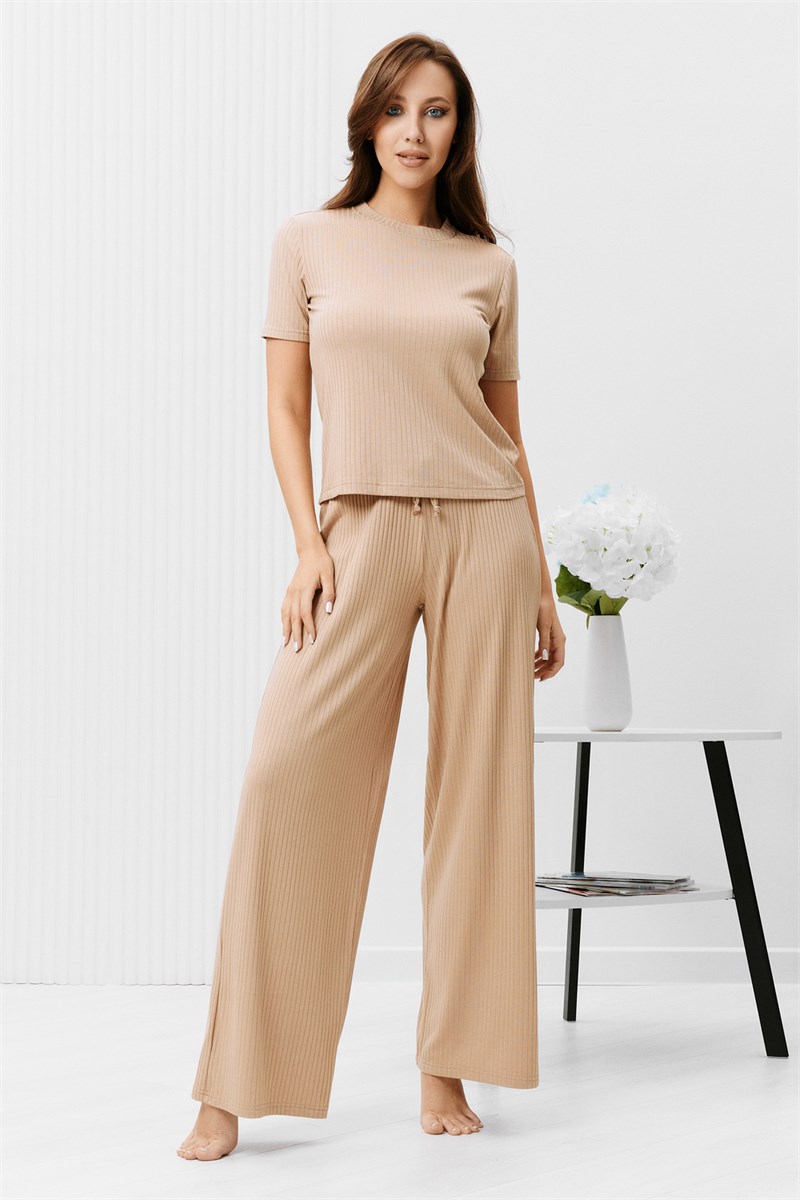 Брюки палаццо с высокой посадкой, широким цельнокроенным поясом вместе с футболкой создадут эффектный образ в повседневной жизни. Костюм прекрасно подойдёт для дома, а с шортиками станет комфортной одеждой для сна. Лёгкая струящаяся текстура ткани придаст ощущение прохлады в жаркую погоду. Каждый элемент комплекта может использоваться отдельно в комбинации с другими изделиями.