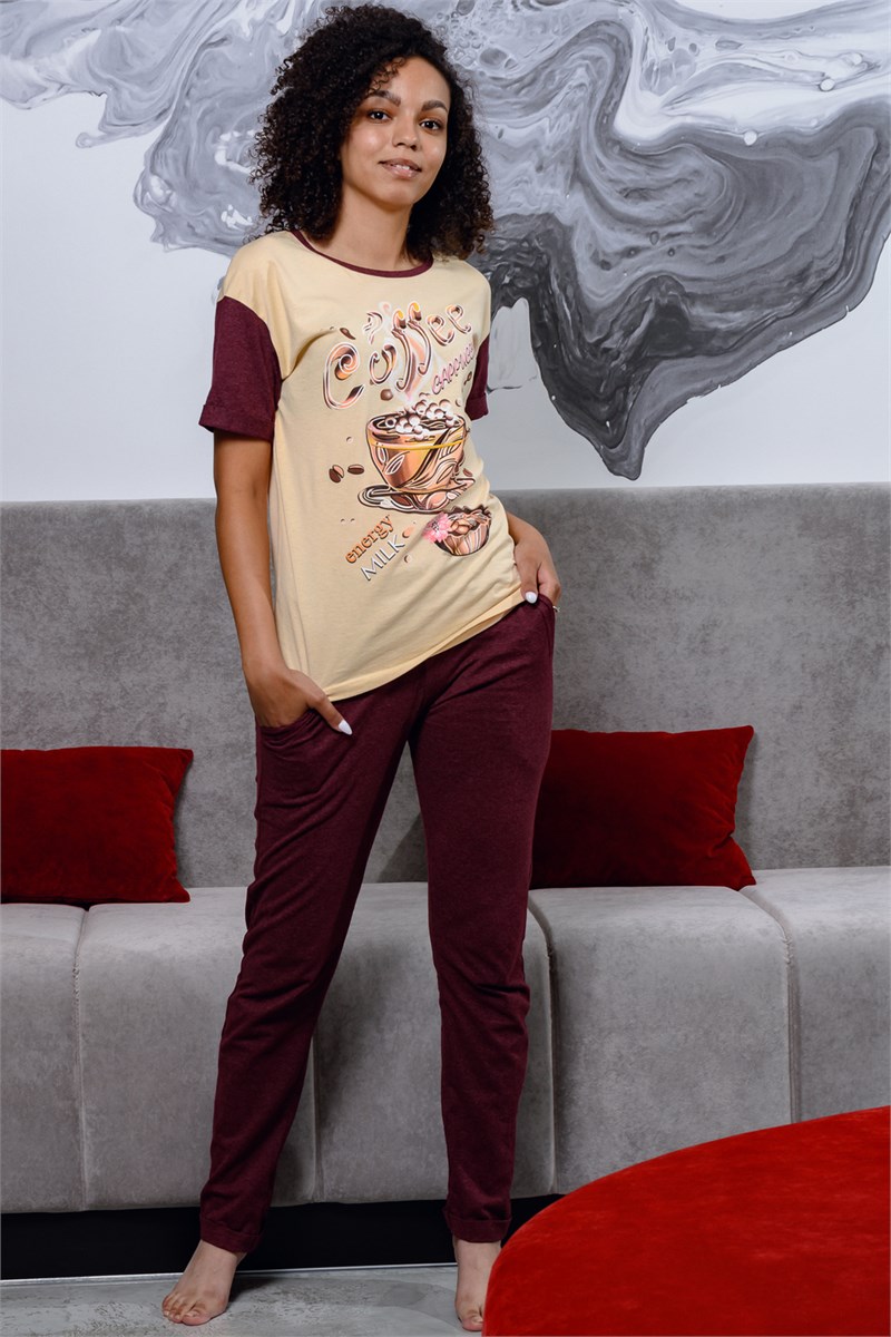 Домашний костюм с кофейным принтом. Футболка слегка приталенного силуэта со спущенной проймой. Рукава и брюки с цельнокроеными манжетами. Горловина обработана бейкой. Брюки не свободного кроя, заужены к низу. Пояс обработан эластичной широкой резинкой 3 см. В боковых швах карманы. Благодаря наличию в составе ткани полиэстера, колени на брюках не вытягиваются. Оттенок бордо может отличаться