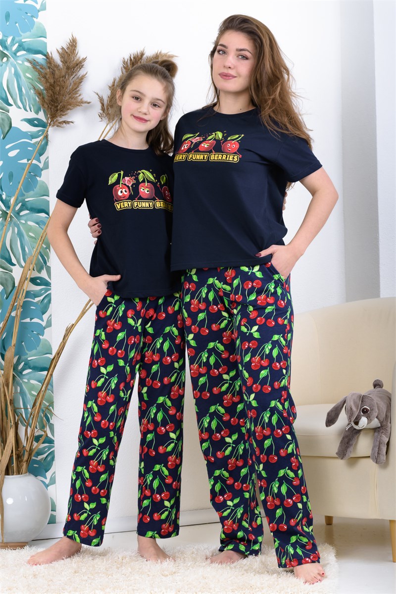 Костюм для подростков с композицией Забавные вишенки. Футболка свободного кроя, укороченная, со спущенным плечом. Брюки длинные, свободные на широком поясе с карманами. Рекомендуется деликатная стирка