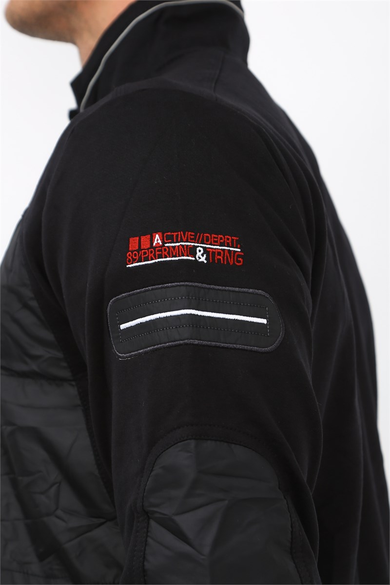 Спортивный мужской костюм. Кофта на молнии, спереди и на рукавах декоративная вставка из плащевки, сбоку вышивка с надписью. Воротник - стойка, низ кофты и рукава на резинке. Брюки прямого кроя, карманы на молнии. Турецкая ткань.