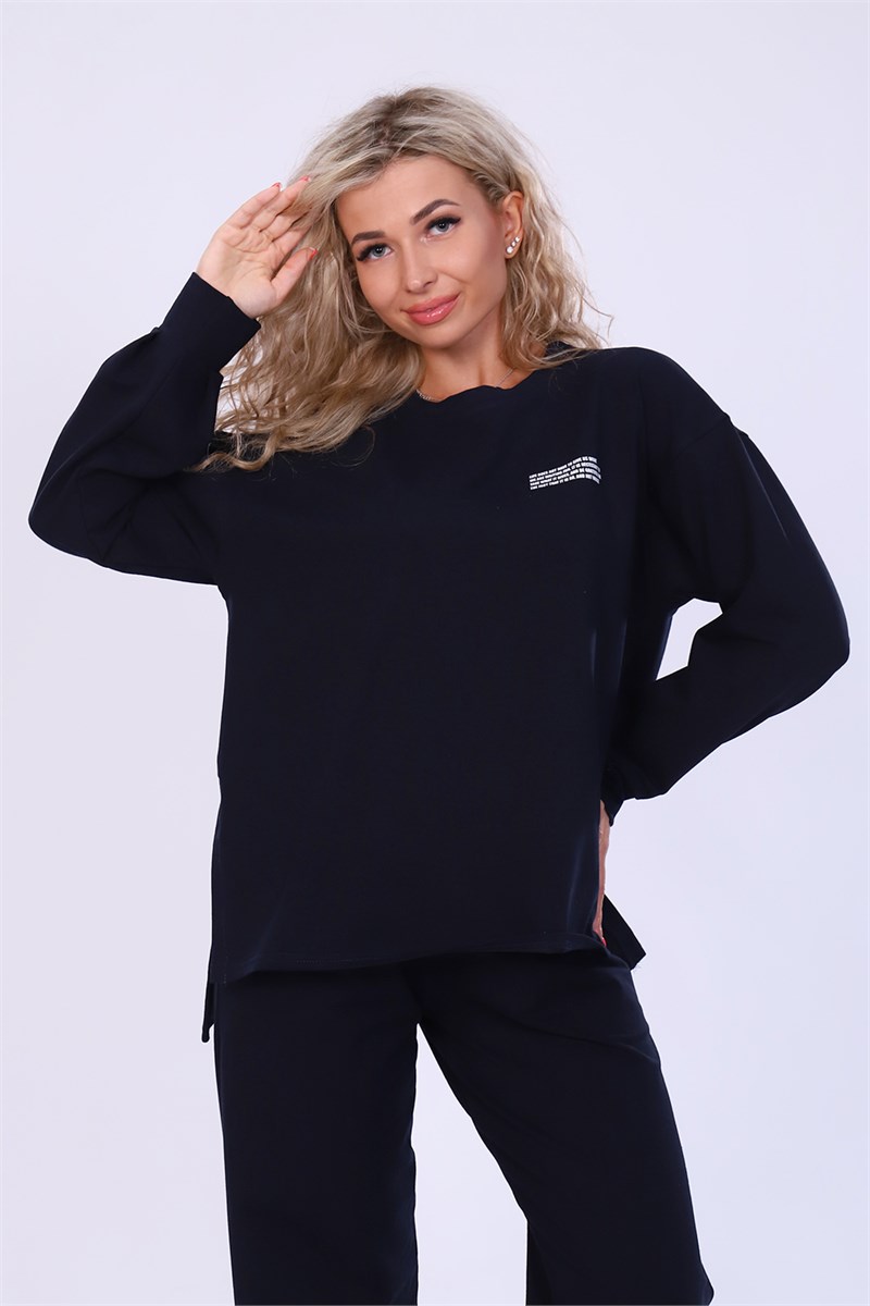 Модный женский костюмчик из плотной ткани. Брюки свободные с карманом, широкие внизу. Кофта свободная по боковым швам разрез. Спинка длиннее, что делает модель модной и стильной. Рукав длинный со складочками на манжете. На груди принт не броский, но придающий вид.