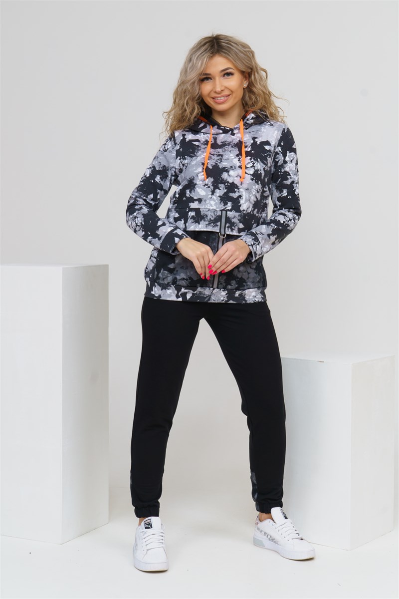 Модный костюм из футера состоит из толстовки с дизайном тай - дай и чёрных брюк. Костюм дополняет отделочная сетка на кармане, капюшоне и вставках брюк. Фурнитура в виде люминесцентного шнурка и металлических полуколец собирает образ в целое, делая современно модный стритстайл-образ. Ну и конечно, светоотражающая лента - это не простая формальность, а необходимость для каждого, кто ценит безопасность...