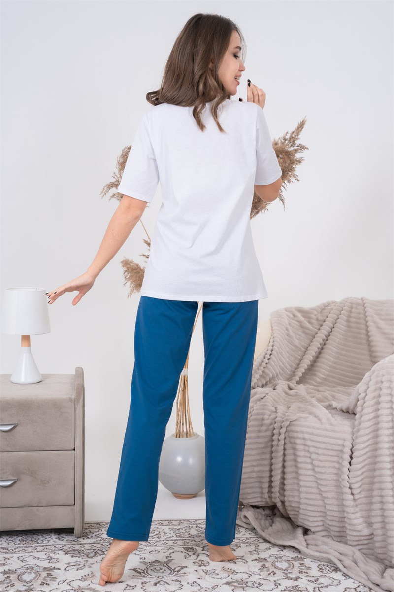 Костюм домашний из мягкого хлопка добавит настроения его обладательнице! Футболка свободного кроя с принтом имеет удлиненный рукав и удобные брючки с карманами гармонируют между собой по сочетанию цветов. Горловина футболки обработана кантом, рукава и низ вподгибку.