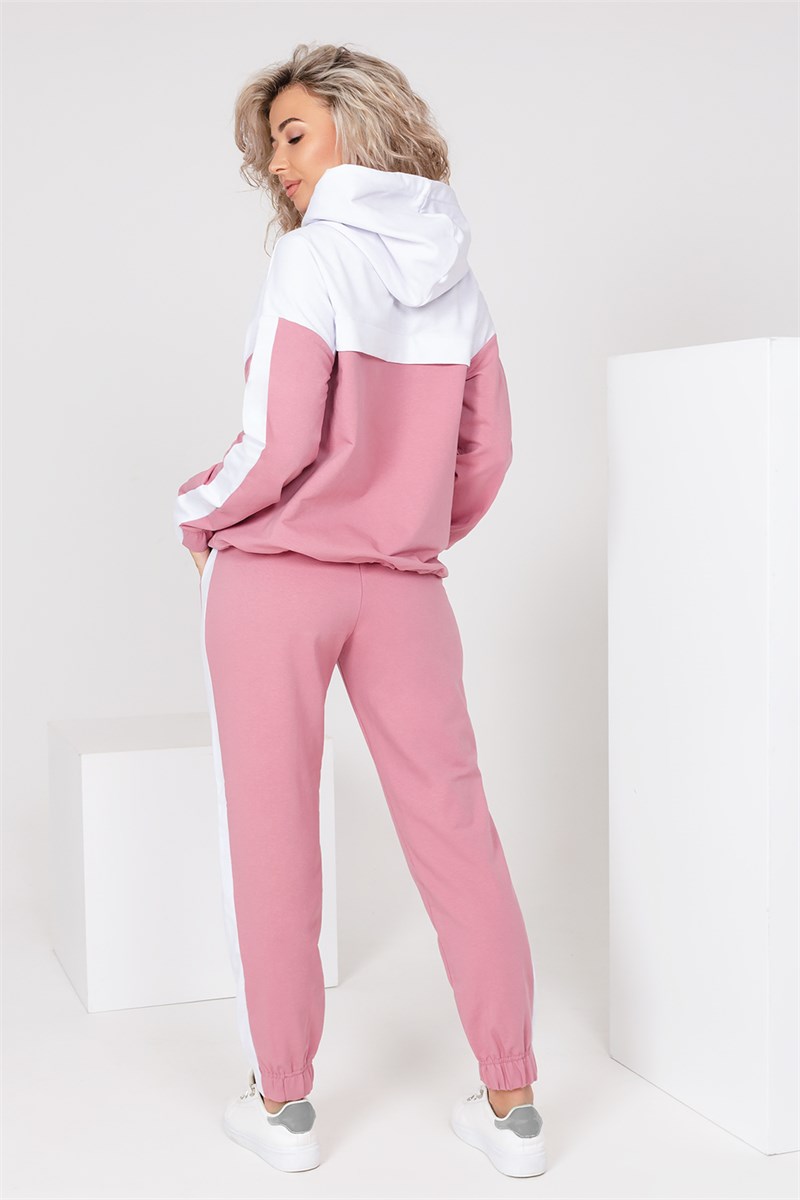 Костюм женский спортивный, состоит из худи и брюк. Толстовка свободного кроя с кокетками спереди и на спинке. На толстовке карман-кенгуру, плечо спущенное, рукава длинные, на рукавах лампасы. Низ рукава на резинке. Низ толстовки с кулисой и шнурком. Капюшон двойной с кулисой и шнурком. Внешний капюшон, кокетки и лампасы выполнены в контрастном цвете. На кокетке толстовки нанесен оригинальный принт - логотип. Брюки джоггеры свободной формы, укороченные. Пояс и низ на резинке. Боковые внутренние карманы. Боковые лампасы брюк в контрастном цвете.