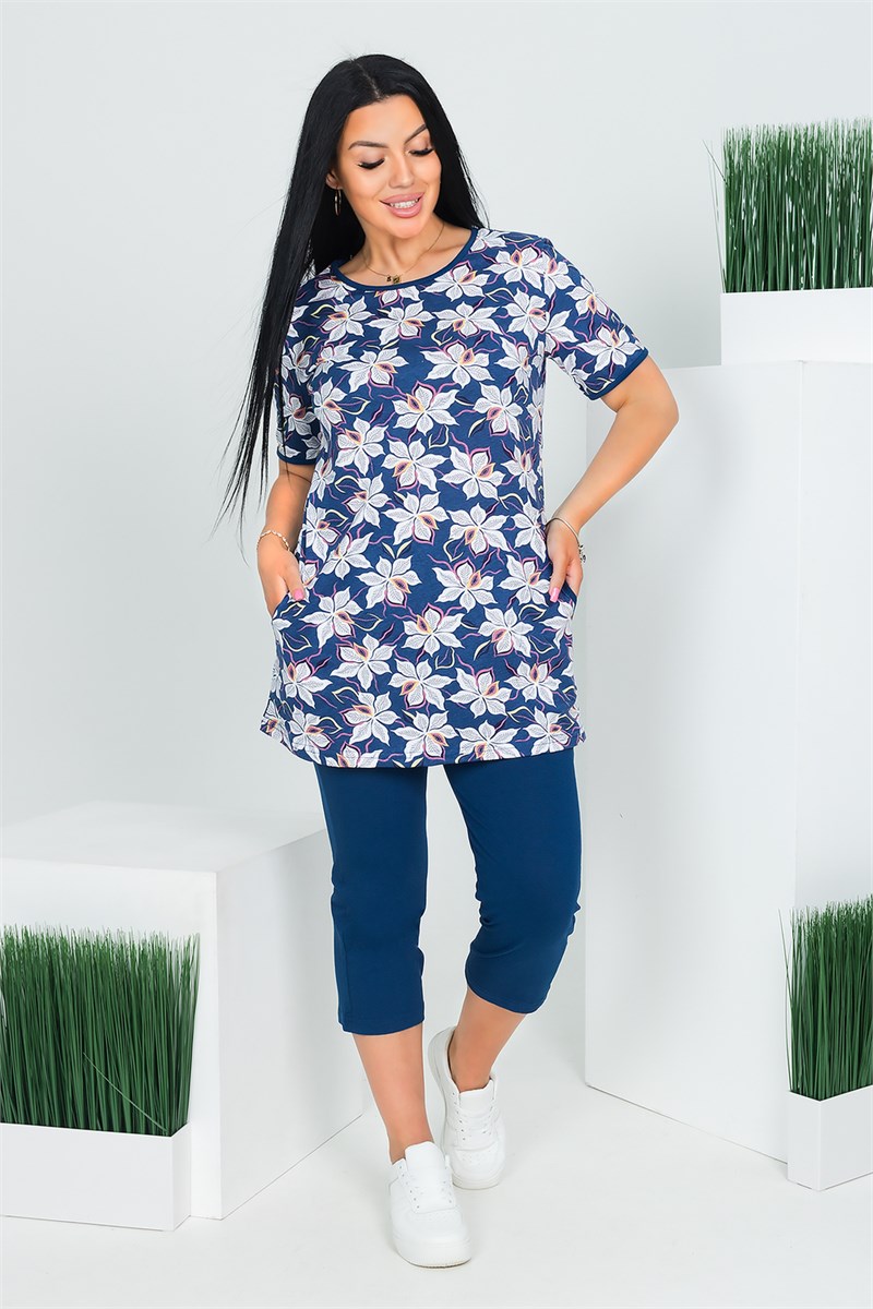 Костюм женский из кулирного трикотажного полотна состоит из туники и бридж. Туника полу прилегающего силуэта, слегка расширенная к низу, длиной до середины бедра. Рукава втачные короткие. Боковые карманы с окантованным входом. Горловина округлой формы и низ рукава окантованы отделочным полотном. Бриджи базовые, облегающие фигуру, длиной до середины икр.