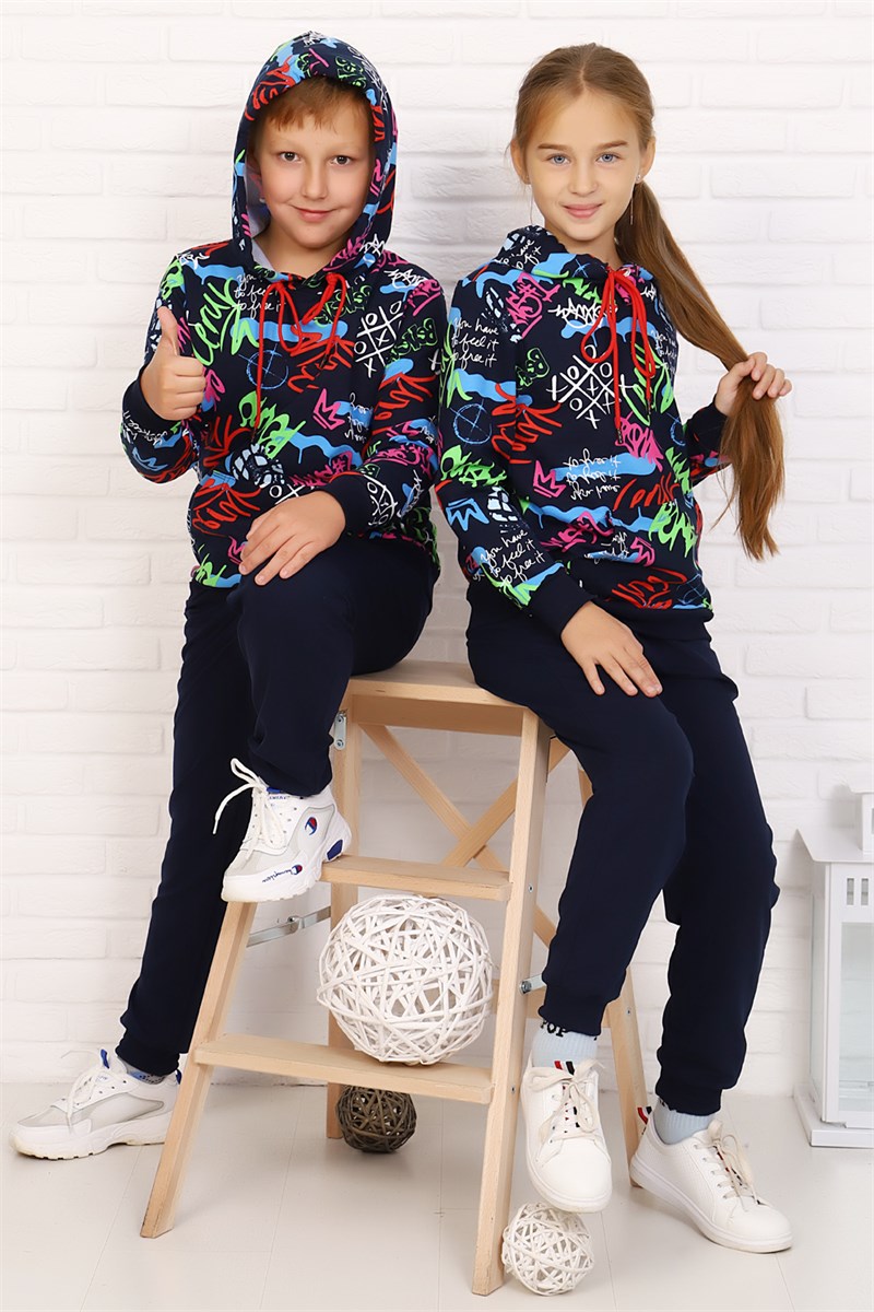 Легкий спортивный костюм для подростков. Свободная толстовка с капюшоном, на полочке расположен карман-кенгуру. Рукав и низ на манжете. Брюки с карманами, на манжете. Подходит как для девочек, так и для мальчиков.
