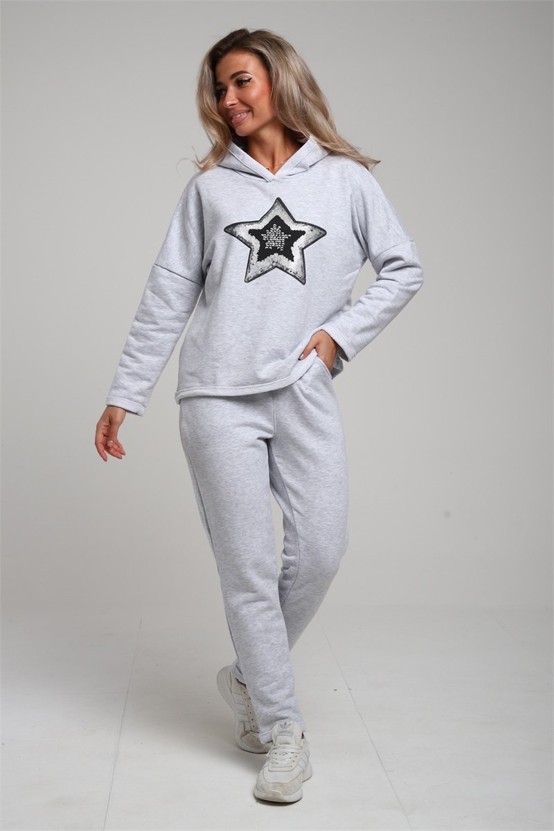 Костюм женский состоит из толстовки и брюк. Брюки прямые с карманами. Толстовка с капюшоном, рукав спущенный, низ изделия полукруглый, перед короче спинки, на полочке печать. Весь костюм подогнут наизнанку декоративной обработкой