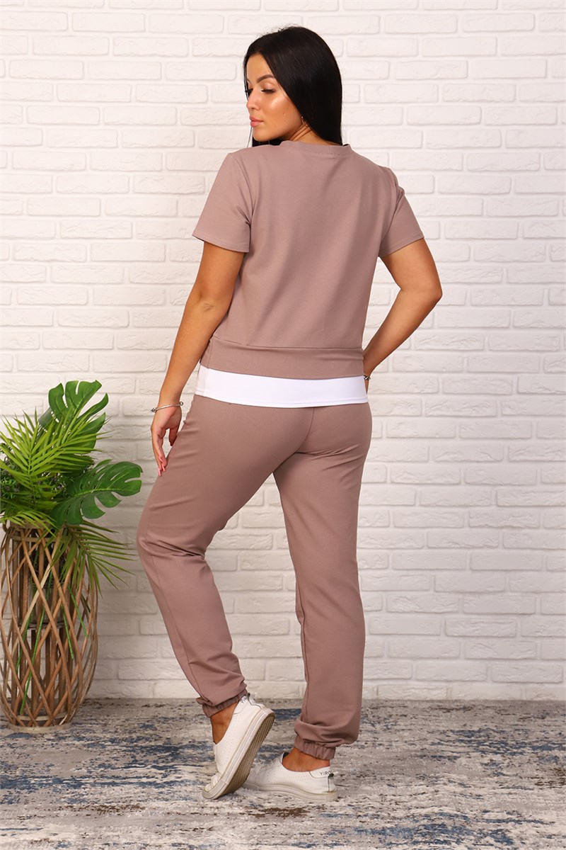 Костюм женский трикотажный - футболка и брюки. Футболка укороченная с отделкой по низу контрастного цвета. Брюки с завязками и втачными боковыми карманами. На футболке и брюки небольшие отделочные печати.