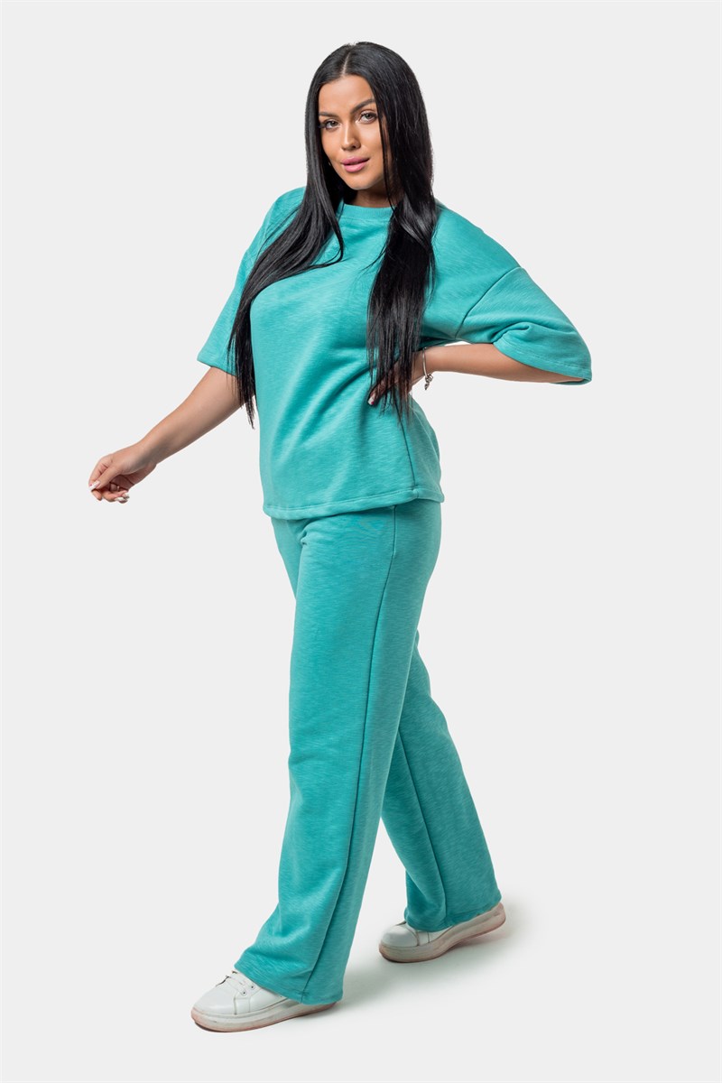 Женский костюм с брюками и футболкой, выполненный из приятной плотной ткани. Отличный вариант для прогулок, встреч и просто домашнего использования. По отдельности вещи из комплекта можно комбинировать с другими элементами гардероба, к примеру, джинсами или коротким спортивным топом. Подойдет девушкам и женщинам разных возрастов, так как имеет классический свободный крой.