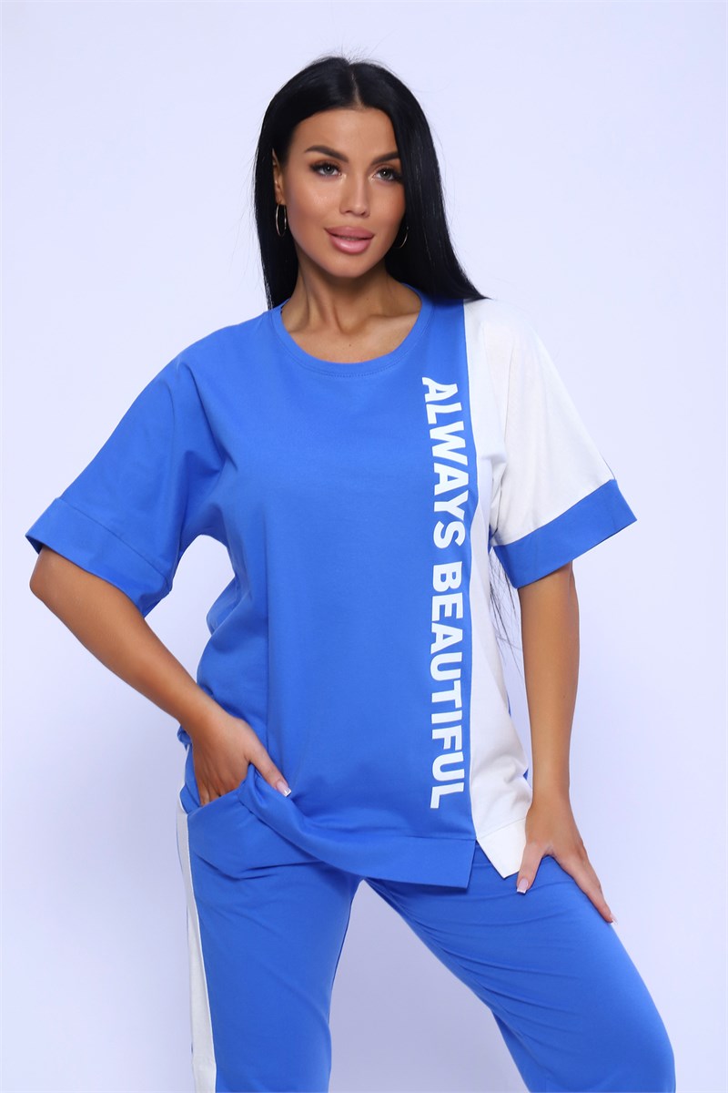 Эффектный костюм в спортивном стиле из трикотажного полотна ярких оттенков. В комплекте представлена кофта свободного кроя со спущенным рукавом и узкие, но не обтягивающие брюки. Изюминкой костюма является сочетание контрастных цветов в дизайне кофты в виде крупных латинских букв и целых вставок. Трикотажные костюмы стали одним из самых популярных и востребованных атрибутов в гардеробе современных женщин, так как не только подчеркивают стиль и индивидуальность, но и обеспечивают комфорт и удобство в повседневной жизни.